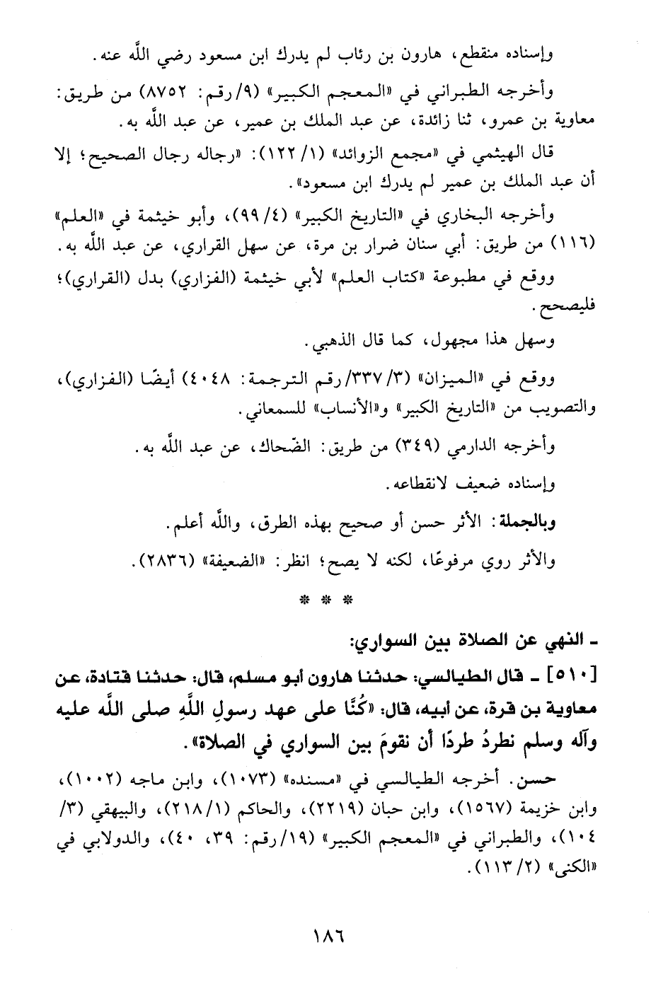 510 - قال الطيالسي: حدثنا هارون أبو مسلم، قال: حدثنا قتادة، عن معاوية بن قرة، عن أبيه، قال: "كُنَّا على عهد رسولِ اللهِ - صلى الله عليه وآله وسلم - نطردُ طردًا أن نقومَ بين السواري في الصلاة".