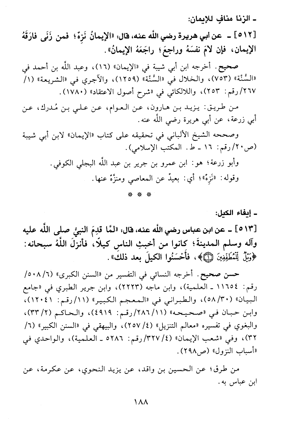 513 - عن ابن عباس - رضي الله عنه -، قال: "لمَّا قدِمَ النبيُّ - صلى الله عليه وآله وسلم - المدينةَ؛ كانوا من أخبثِ الناسِ كيلًا، فأنزلَ اللهُ سبحانه: {وَيْلٌ لِلْمُطَفِّفِينَ}، فأَحْسَنُوا الكيلَ بعد ذلك".