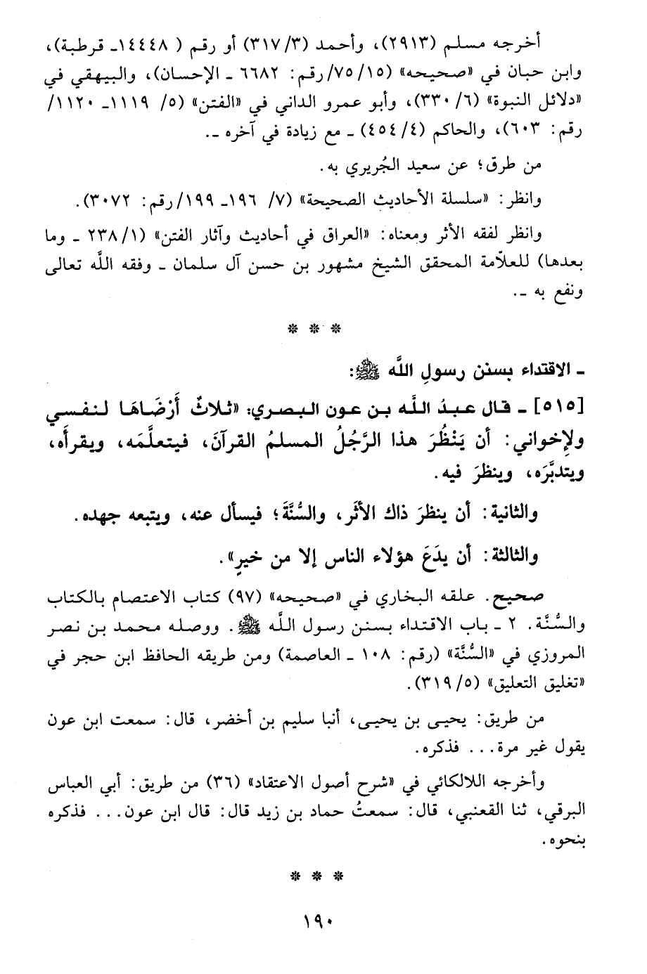 515 - قال عبدُ الله بن عون البصري: "ثلاث أَرْضَاهَا لنفسي ولإِخواني: أن يَنْظُرَ هذا الرَّجُلُ المسلمُ القرآنَ، فيتعلَّمَه، ويقرأَه، ويتدبَّرَه، وينظرَ فيه.