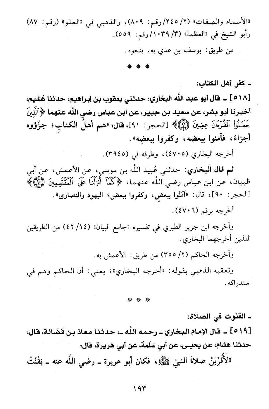 518 - قال أبو عبد الله البخاري: حدثني يعقوب بن إبراهيم، حدثنا هُشيم، أخبرنا أبو بشر، عن سعيد بن جبير، عن ابن عباس - رضي الله عنهما - {الَّذِينَ جَعَلُوا الْقُرْآنَ عِضِينَ (91)} [الحجر: 91]، قال: "هم أهلُ الكتابِ؛ جزَّؤوه أجزاءً، فآمنوا ببعضه، وكفروا ببعضِه".