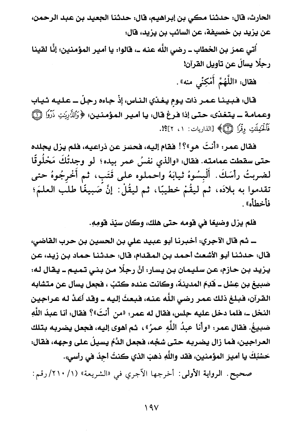 - ثم قال الآجري؛ أخبرنا أبو عبيد علي بن الحسين بن حرب القاضي، قال: حدثنا أبو الأشعث أحمد بن المقدام، قال: حدثنا حماد بن زيد، عن يزيد بن حازم، عن سليمان بن يسار: أنَّ رجلًا من بني تميم - يقال له: صَبيغ بن عِسْل- قَدِمَ المدينةَ، وكانت عنده كتب، فجعل يسأل عن متشابه القرآن، فبلغ ذلك عمر - رضي الله عنه -، فبعثَ إليه- وقد أَعَدَّ له عراجين النخل-، فلما دخل عليه جلس، فقال له عمر: "من أنتَ"؟ فقال: أنا عبدُ اللهِ صَبيغُ. فقال عمر: "وأنا عبدُ اللهِ عمرُ"، ثم أهوى إليه، فجعل يضربه بتلك العراجين، فما زال يضربه حتى شجَّه، فجعل الدَّمُ يسيلُ على وجهه، فقال: حَسْبُكَ يا أميرَ المؤمنين، فقد واللهِ ذهبَ الذي كنتُ أجِدُ في رأسي".