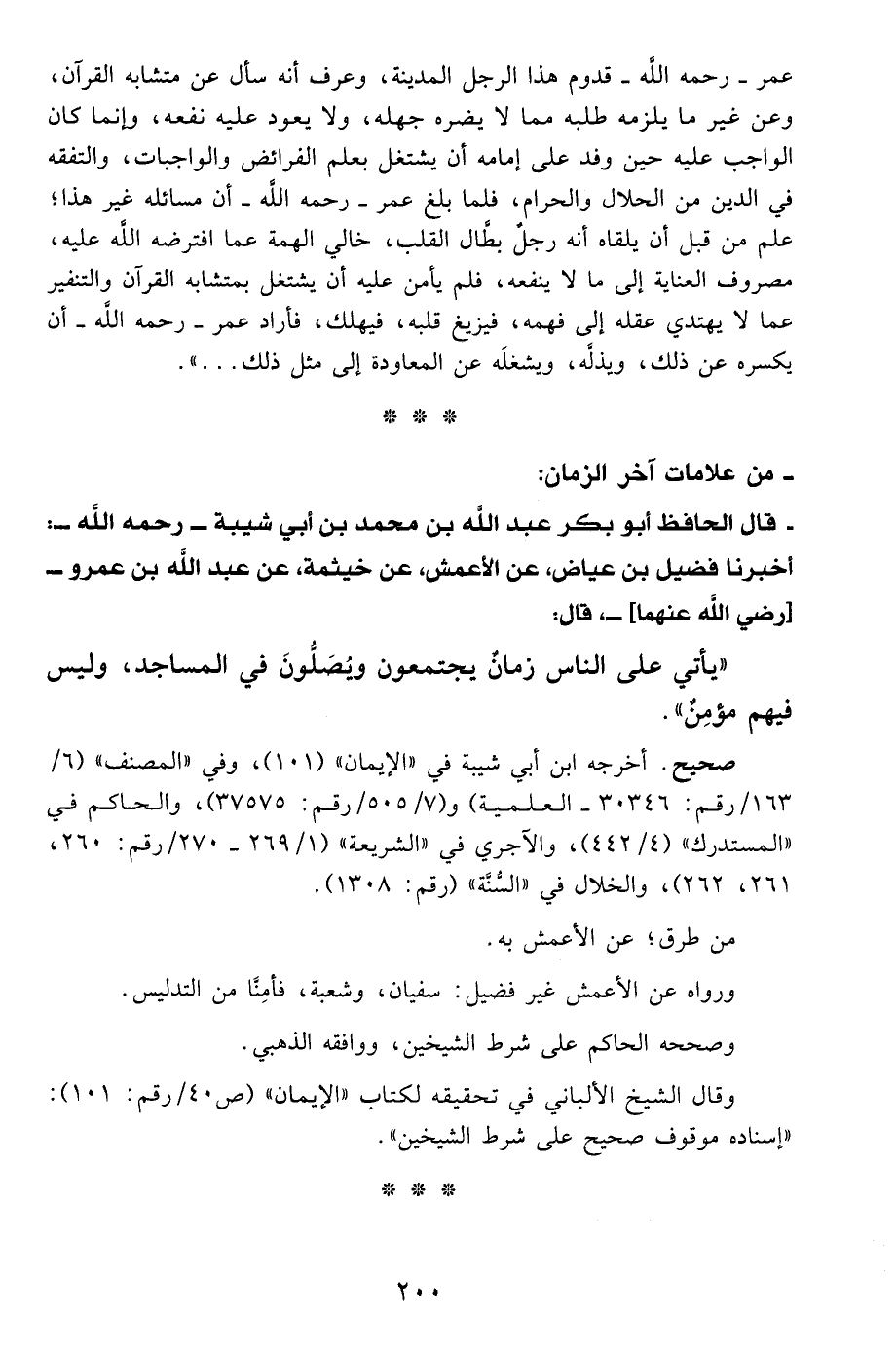 وقال الشيخ الألباني في تحقيقه لكتاب "الإيمان" (ص 40/ رقم: 101): "إسناده موقوف صحيح على شرط الشيخين".