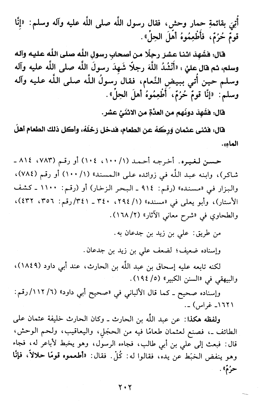 ولفظه هكذا: عن عبد الله بن الحارث- وكان الحارث خليفة عثمان على الطائف-، فصنع لعثمان طعامًا فيه من الحجَلِ، واليعاقيب، ولحم الوحش، قال: فبعث إلى علي بن أبي طالب، فجاءه الرسول، وهو يخبط لأباعر له، فجاء وهو ينفض الخبَط عن يده، فقالوا له: كُلْ. فقال: "أطعموه قومًا حلالًا، فإنَّا حرُمٌ".