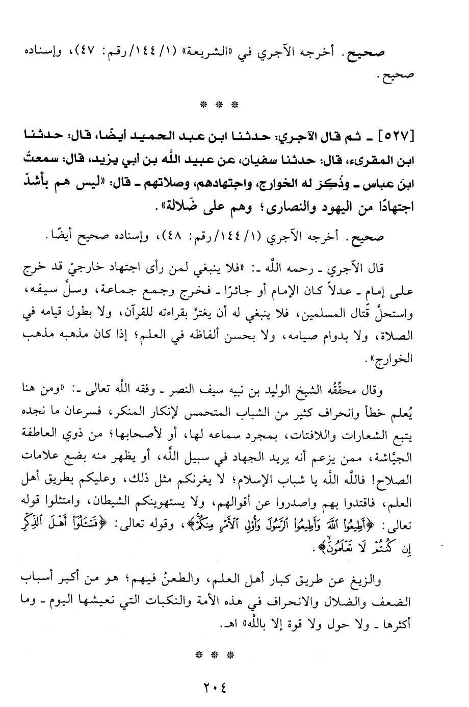 527 - ثم قال الآجري: حدثنا ابن عبد الحميد أيضًا، قال: حدثنا ابن المقرئ، قال: حدثنا سفيان، عن عبيد الله بن أبي يزيد، قال: سمعتُ ابنَ عباس- وذُكِرَ له الخوارج، واجتهادهم، وصلاتهم - قال: "ليس هم بأشدّ اجتهادَا من اليهود والنصارى؛ وهم على ضَلالة".