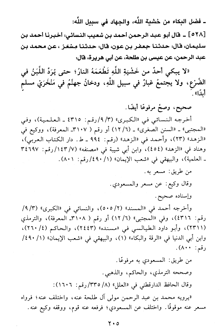 528 - قال أبو عبد الرحمن أحمد بن شعيب النسائي: أخبرنا أحمد بن سليمان، قال: حدثنا جعفر بن عون، قال: حدثنا مِسْعَرٌ، عن محمد بن عبد الرحمن، عن عيسى بن طلحة، عن أبي هريرة، قال:
