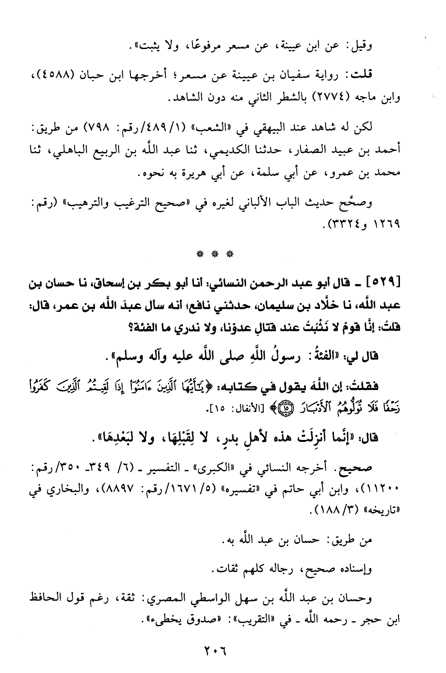 529 - قال أبو عبد الرحمن النسائي: أنا أبو بكر بن إسحاق، نا حسان بن عبد الله، نا خلَّاد بن سليمان، حدثني نافع؛ أنه سأل عبدَ الله بن عمر، قال: قلتُ: إنَّا قومٌ لا نَثْبُتُ عند قتالِ عدوّنا، ولا ندري ما الفئة؟