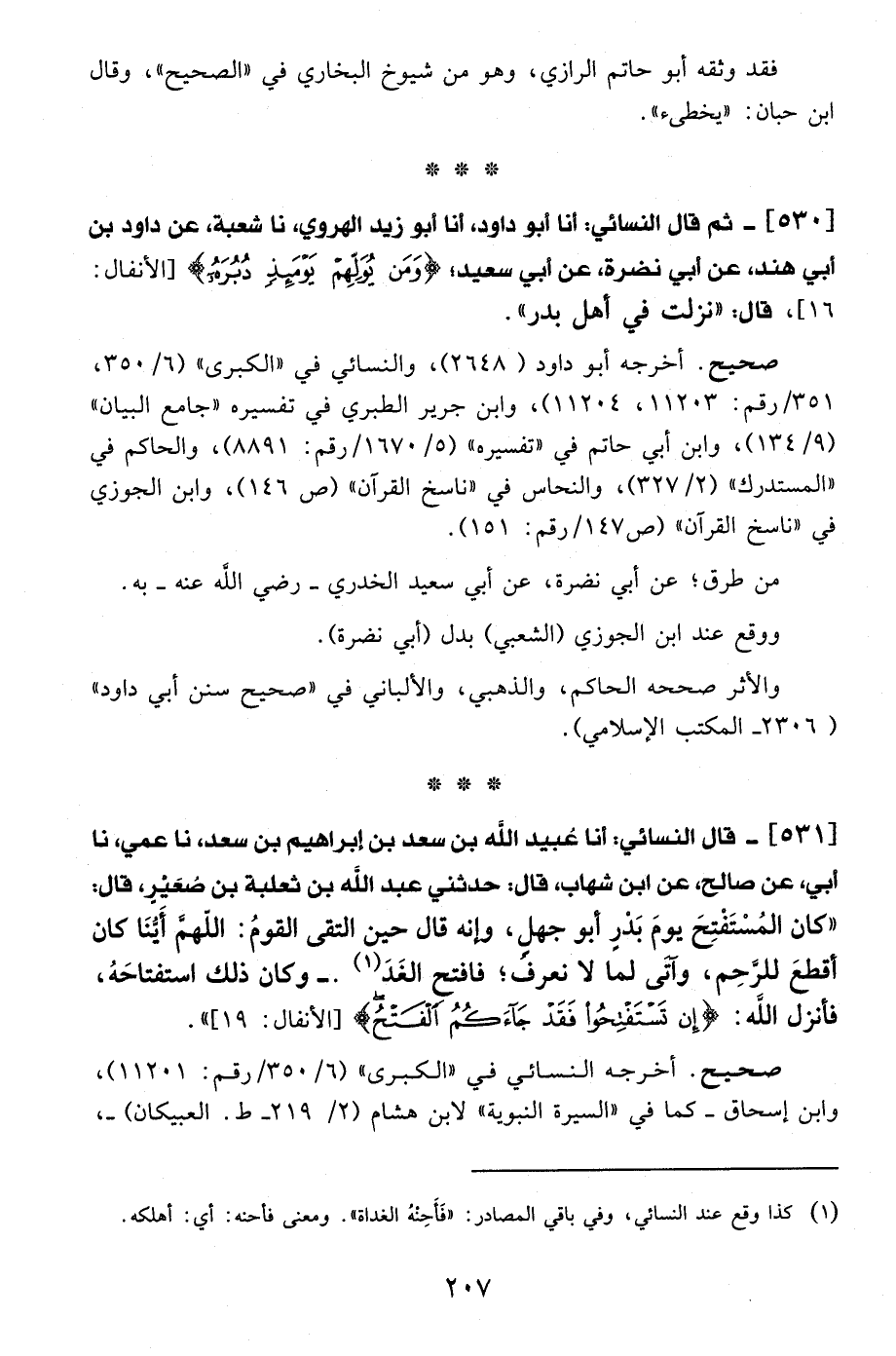 530 - ثم قال النسائي: أنا أبو داود، أنا أبو زيد الهروي، نا شعبة، عن داود بن أبي هند، عن أبي نضرة، عن أبي سعيد، {وَمَنْ يُوَلِّهِمْ يَوْمَئِذٍ دُبُرَهُ} [الأنفال: 16]، قال: "نزلت في أهل بدر".