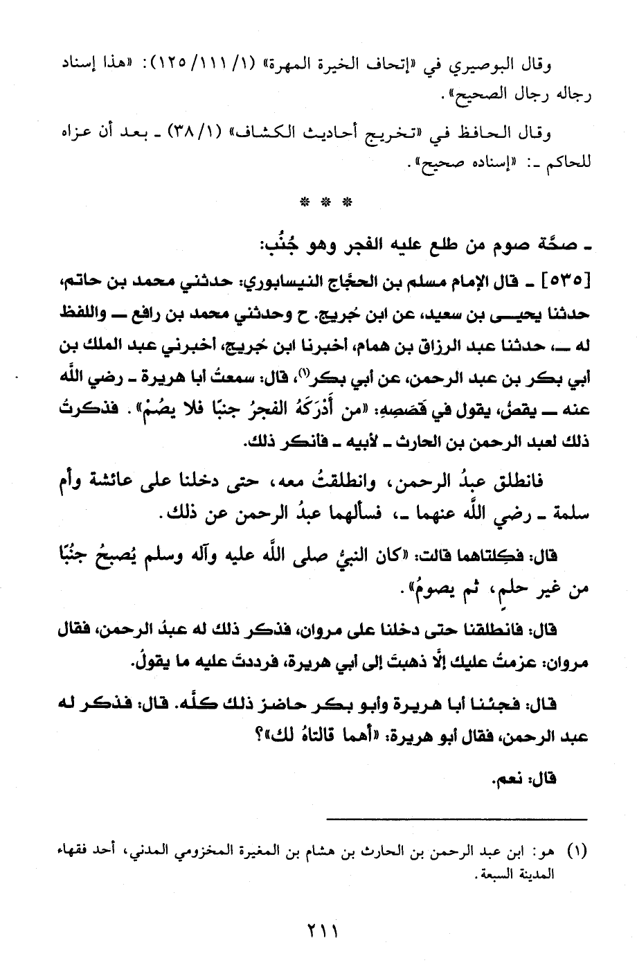 535 - قال الإمام مسلم بن الحجاج النيسابوري: حدثني محمد بن حاتم، حدثنا يحيى بن سعيد، عن ابن جُريج. ح وحدثني محمد بن رافع -واللفظ له-، حدثنا عبد الرزاق بن همام، أخبرنا ابن جُريج، أخبرني عبد الملك بن أبي بحر بن عبد الرحمن، عن أبي بكر (¬1)، قال: سمعتُ أبا هريرة - رضي الله عنه- يقصُّ، يقول في قَصَصِهِ: "من أَدْرَكَهُ الفجرُ جنبًا فلا يصُمْ". فذكرتُ ذلك لعبد الرحمن بن الحارث -لأبيه- فأنكر ذلك.