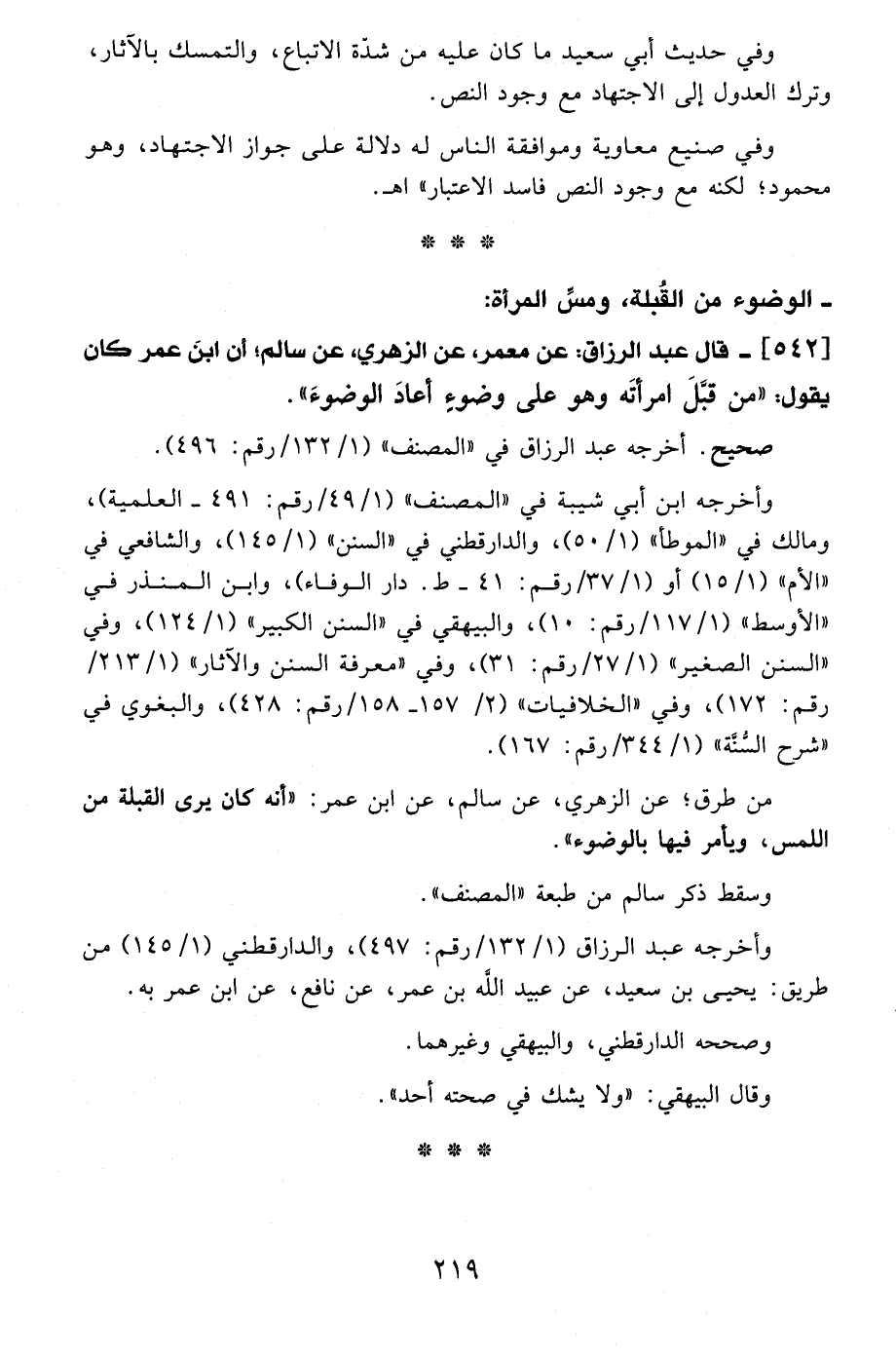 542 - قال عبد الرزاق: عن معمر، عن الزهري، عن سالم؛ أن ابنَ عمر كان يقول: "من قبَّلَ امرأتَه وهو على وضوءِ أعادَ الوضوءَ".