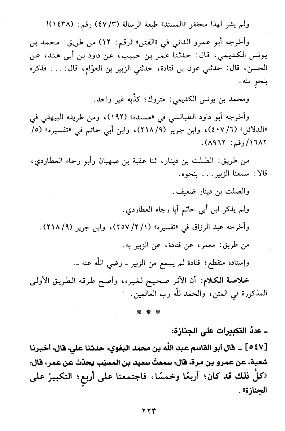 547 - قال أبو القاسم عبد الله بن محمد البغوي: حدثنا علي، قال: أخبرنا شعبة، عن عمرو بن مرة، قال: سمعت سعيد بن المسيب يحدّث عن عمر، قال: "كل ذلك قد كان؛ أربعًا وخمسًا، فاجتمعنا على أربع؛ التكبيرُ على الجنازة".