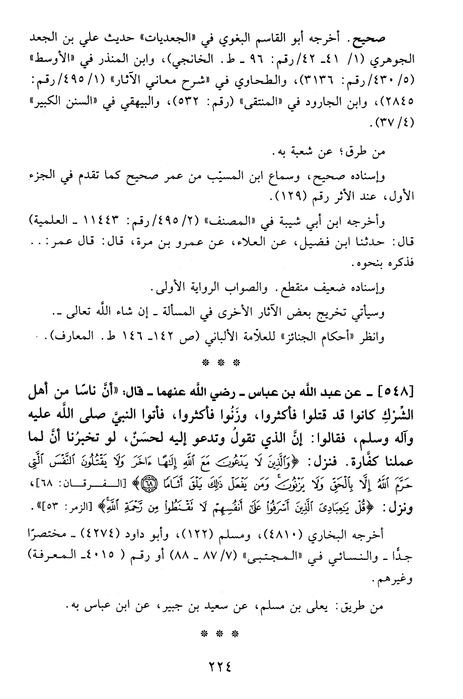 548 - عن عبد الله بن عباس - رضي الله عنهما - قال: "أن ناسًا من أهل الشرْكِ كانوا قد قتلوا فأكثروا، وزَنُوا فأكثروا، فأتوا النبيَّ - صلى الله عليه وآله وسلم -، فقالوا: إن الذي تقولُ وتدعو إليه لحسَنٌ، لو تخبرُنا أنَّ لما عملنا كفَّارة. فنزل: {وَالَّذِينَ لَا يَدْعُونَ مَعَ اللهِ إِلَهًا آخَرَ وَلَا يَقْتُلُونَ النَّفْسَ الَّتِي حَرَّمَ اللهُ إِلَّا بِالْحَقِّ وَلَا يَزْنُونَ وَمَنْ يَفْعَلْ ذَلِكَ يَلْقَ أَثَامًا (68)} [الفرقان: 68]، وئزل: {قُلْ يَاعِبَادِيَ الَّذِينَ أَسْرَفُوا عَلَى أَنْفُسِهِمْ لَا تَقْنَطُوا مِنْ رَحْمَةِ اللهِ} [الزمر: 53].