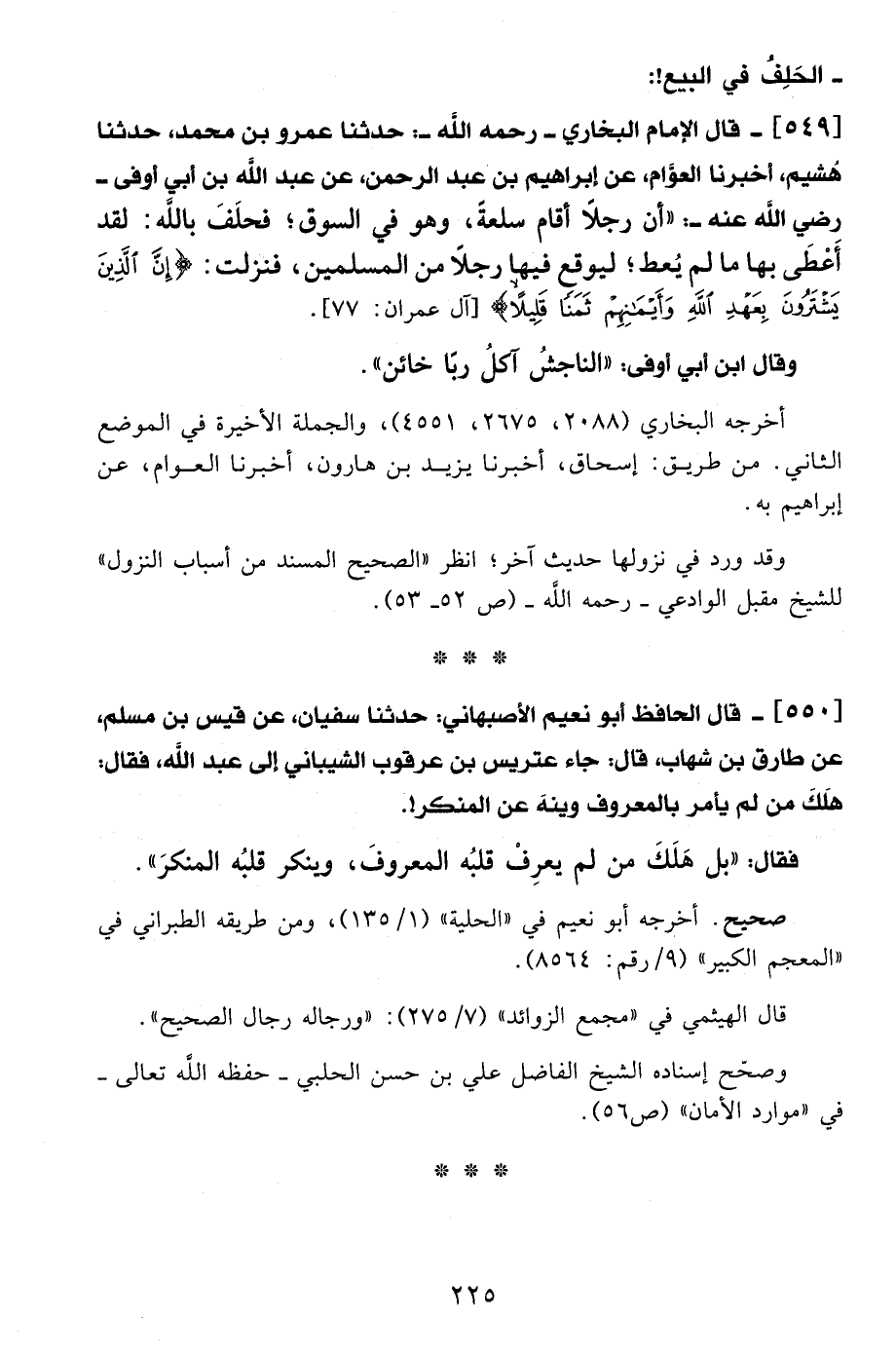 549 - قال الإمام البخاري -رَحِمَهُ اللهُ-: حدثنا عمرو بن محمد، حدثنا هُشيم، أخبرنا العوَّام، عن إبراهيم بن عبد الرحمن، عن عبد الله بن أبي أوفى - رضي الله عنه -: "أن رجلًا أقام سلعةً، وهو في السوق؛ فحلَفَ بالله: لقد أَعْطَى بها ما لم يُعط؛ ليوقع فيها رجلًا من المسلمين، فنزلت: {إِنَّ الَّذِينَ يَشْتَرُونَ بِعَهْدِ اللهِ وَأَيْمَانِهِمْ ثَمَنًا قَلِيلًا} [آل عمران: 77].