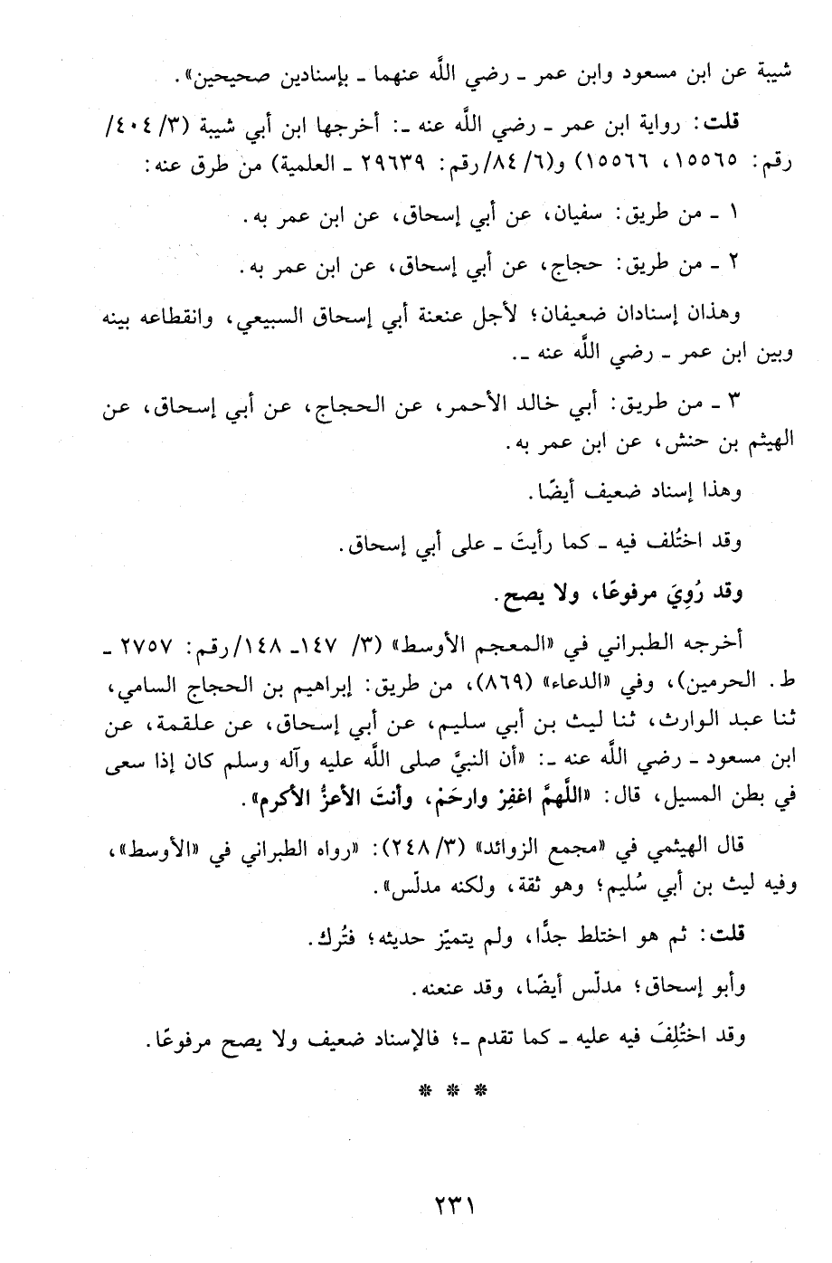 أخرجه الطبراني في "المعجم الأوسط" (3/ 147 - 148/ رقم: 2757 - ط. الحرمين)، وفي "الدعاء" (869)، من طريق: إبراهيم بن الحجاج السامي، ثنا عبد الوارث، ثنا ليث بن أبي سليم، عن أبي إسحاق، عن علقمة، عن ابن مسعود - رضي الله عنه -: "أن النبي - صلى الله عليه وآله وسلم - كان إذا سعى في بطن المسيل، قال: "اللهم اغفِر وارحَم، وأنتَ الأعزُّ الأكرم".