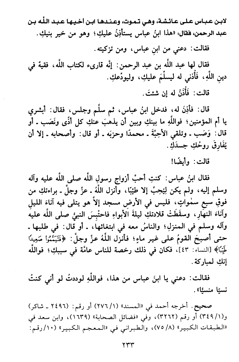 فقال ابنُ عباس: كنتِ أحبَّ أزواج رسولِ الله - صلى الله عليه وآله وسلم - إليه، ولم يكن لِيُحِبَّ إلا طيِّبَا، وأنزل الله -عَزَّ وَجَلَّ- براءتكِ من فوقِ سبع سمواتِ، فليس في الأرضِ مسجد الَّا هو يتلى فيه آناءَ الليلِ وآناءَ النهَارِ، وسقَطَتْ قلادتكِ ليلةَ الأبواءِ فاحتُبسَ النبي - صلى الله عليه وآله وسلم - في المنزلِ؛ والناسُ معه في ابتغائهَا، -أو قال: في طلبها- حتى أصبحَ القومُ على غير ماءِ؛ فأنزل الله -عَزَّ وَجَلَّ-: {فَتَيَمَّمُوا صَعِيدًا طَيِّبًا} [النساء: 43]، فكان في ذلك رخصة للناس عامَّة في سببكِ؛ فوالله إنكِ لمباركة.