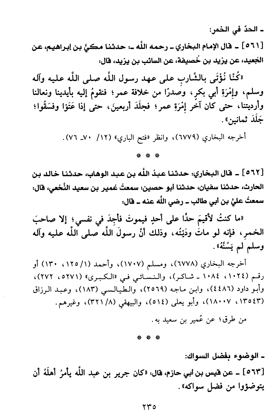 562 - قال البخاري: حدثنا عبدُ الله بن عبد الوهاب، حدثنا خالد بن الحارث، حدثنا سفيان، حدثنا أبو حصين؛ سمعت عُمير بن سعيد النَّخعي، قال: سمعت عليَّ بن أبي طالب - رضي الله عنه - قال:
