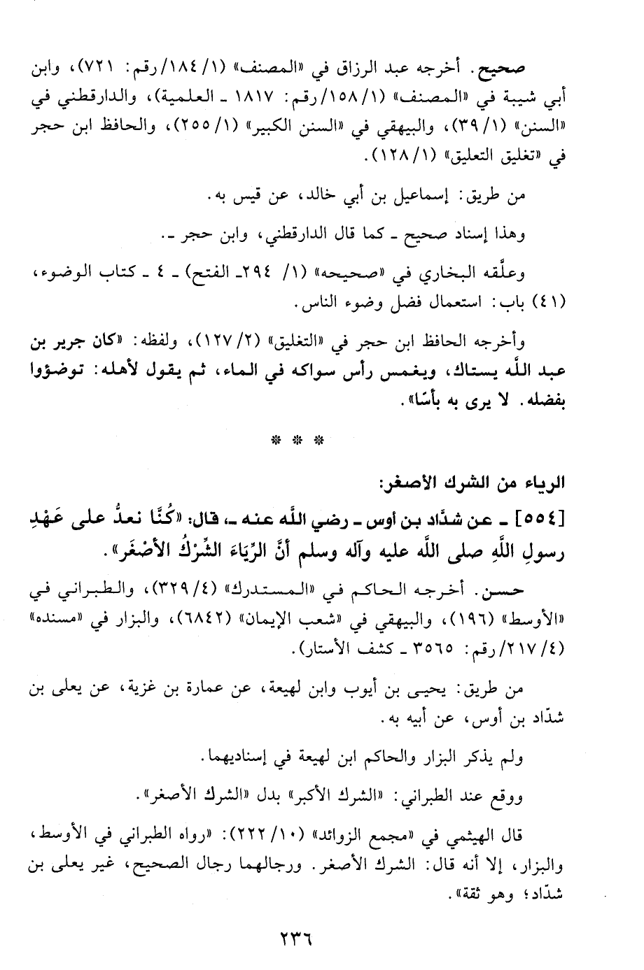 564 - عن شدَّاد بن أوس - رضي الله عنه -، قال: "كُنَّا نعدُّ على عَهْدِ رسولِ اللهِ - صلى الله عليه وآله وسلم - أنَّ الرِّيَاءَ الشِّرْكُ الأصْغَر".
