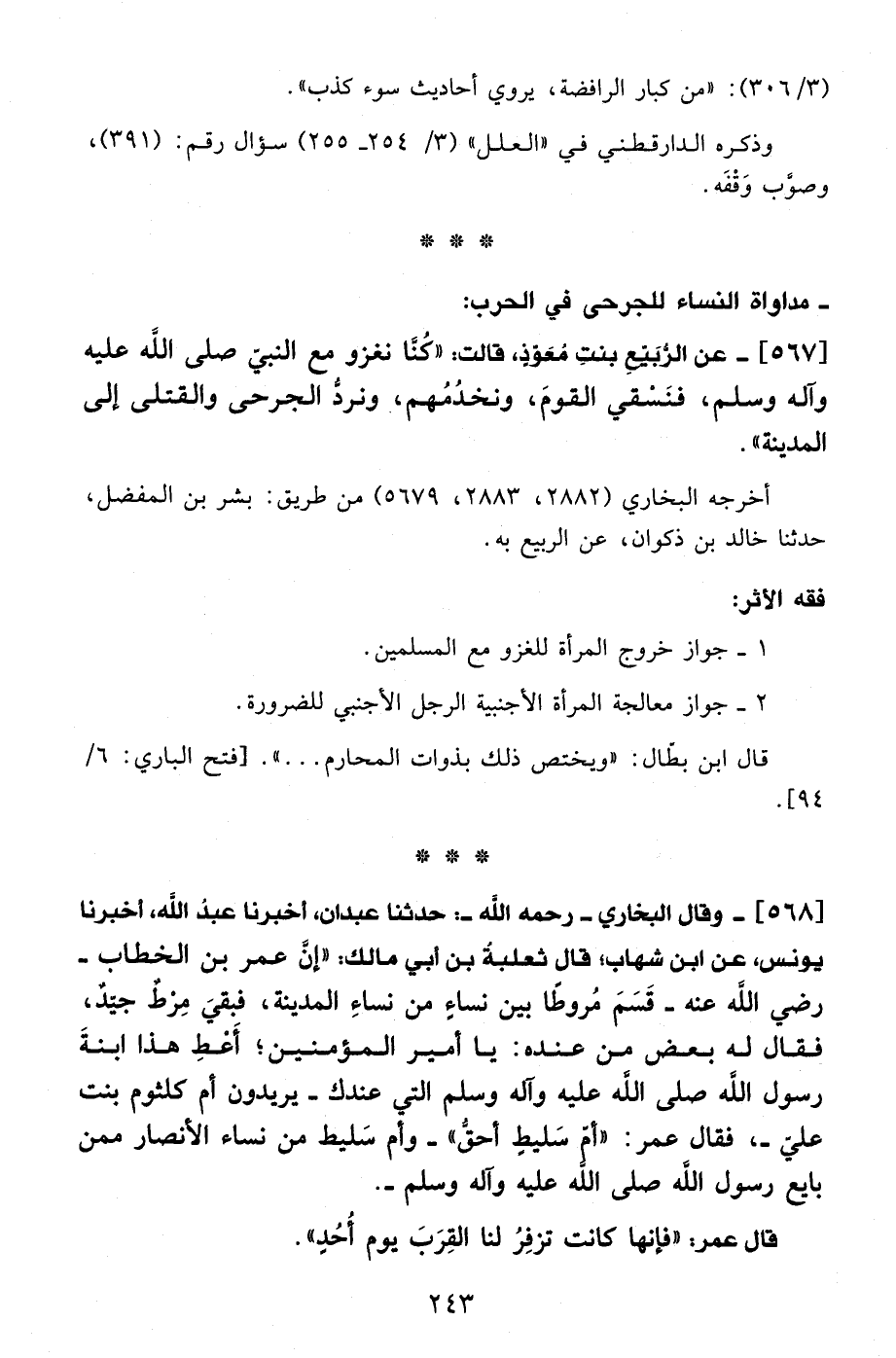 567 - وقال البخاري -رَحِمَهُ اللهُ-: حدثنا عبدان، أخبرنا عبدُ الله، أخبرنا يونس، عن ابن شهاب، قال ثعلبةُ بن أبي مالدً: "إنَّ عمر بن الخطاب - رضي الله عنه - قَسَمَ مُروطًا بين نساءٍ من نساءِ المدينة، فبقيَ مِرْطٌ جيدٌ، فقال له بعض من عنده: يا أمير المؤمنين؛ أَعْطِ هذا ابنةَ رسول الله - صلى الله عليه وآله وسلم - التي عندك -يريدون أم كلثوم بنت علي-، فقال عمر: "أم سَليطٍ أحقُّ" -وأم سَليط من نساء الأنصار ممن بايع رسول الله - صلى الله عليه وآله وسلم -.