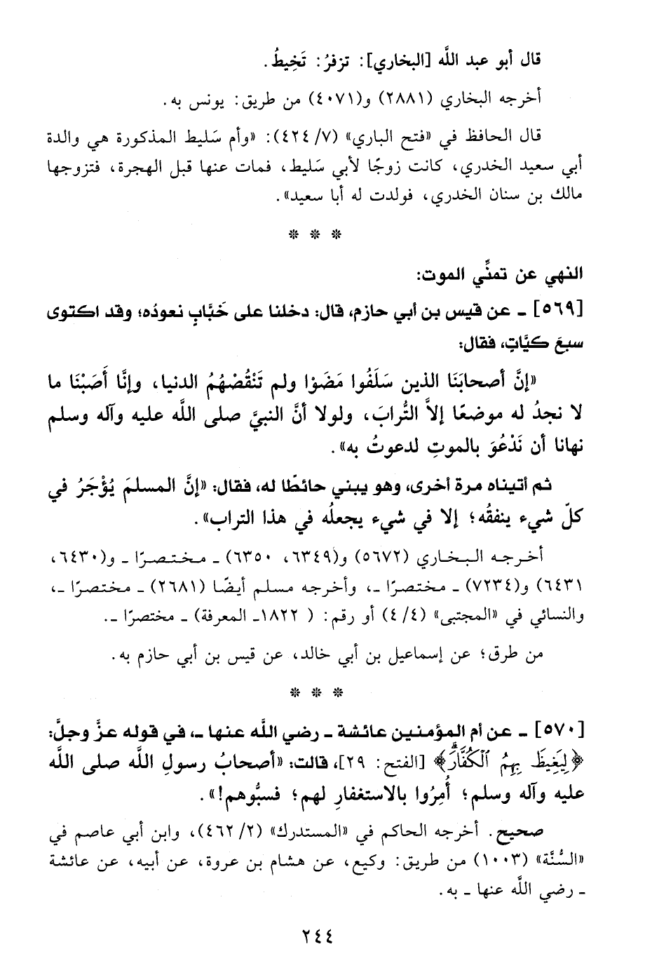 568 - عن قيس بن أبي حازم، قال: دخلنا على خَبَّاب نعودُه؛ وقد اكتوى سبعَ كيَّاتٍ، فقال: