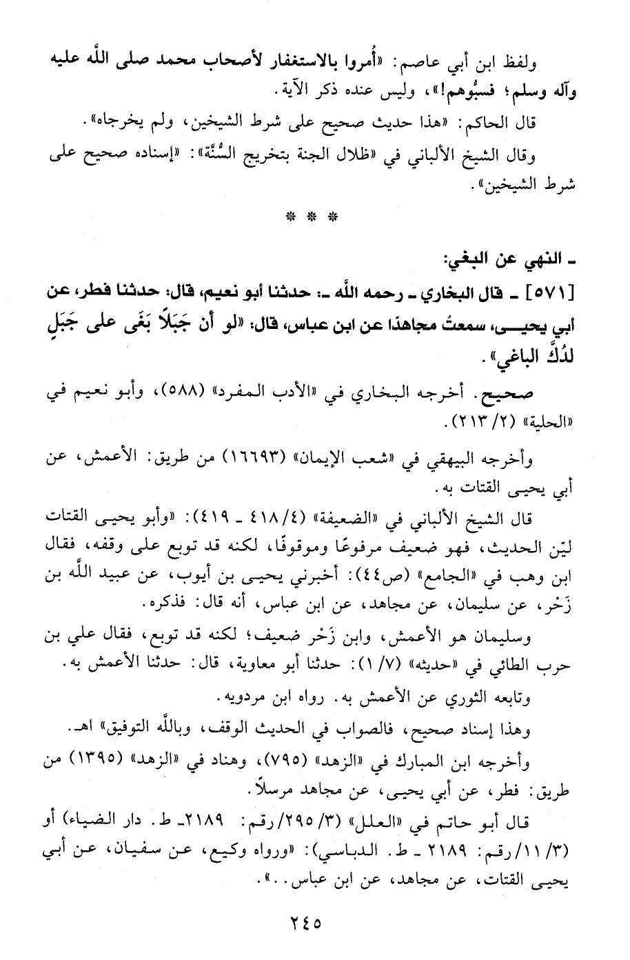 570 - قال البخاري -رَحِمَهُ اللهُ-: حدثنا أبو نعيم، قال: حدثنا فطر، عن أبي يحيى، سمعت مجاهدًا عن ابن عباس، قال: "لو أن جَبَلاً بَغَى على جَبَلٍ لدُكَّ الباغي".