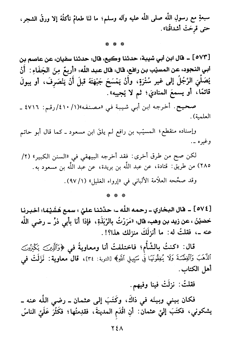 572 - قال ابن أبي شيبة: حدثنا وكيع، قال: حدثنا سفيان، عن عاصم بن أبي النجود، عن المسيب بن رافع، قال: قال عبد الله: "أربعٌ مِنَ الجَفَاءِ: أَنْ يُصَلِّيَ الرَّجُلُ إلى غير سُتْرَةِ، وأَنْ يَمْسَحَ جَبهَتَهُ قبلَ أَنْ يَنْصَرِفَ، أو يبولَ قائمًا، أو يسمعَ المناديَ؛ ثم لا يُجيبه".