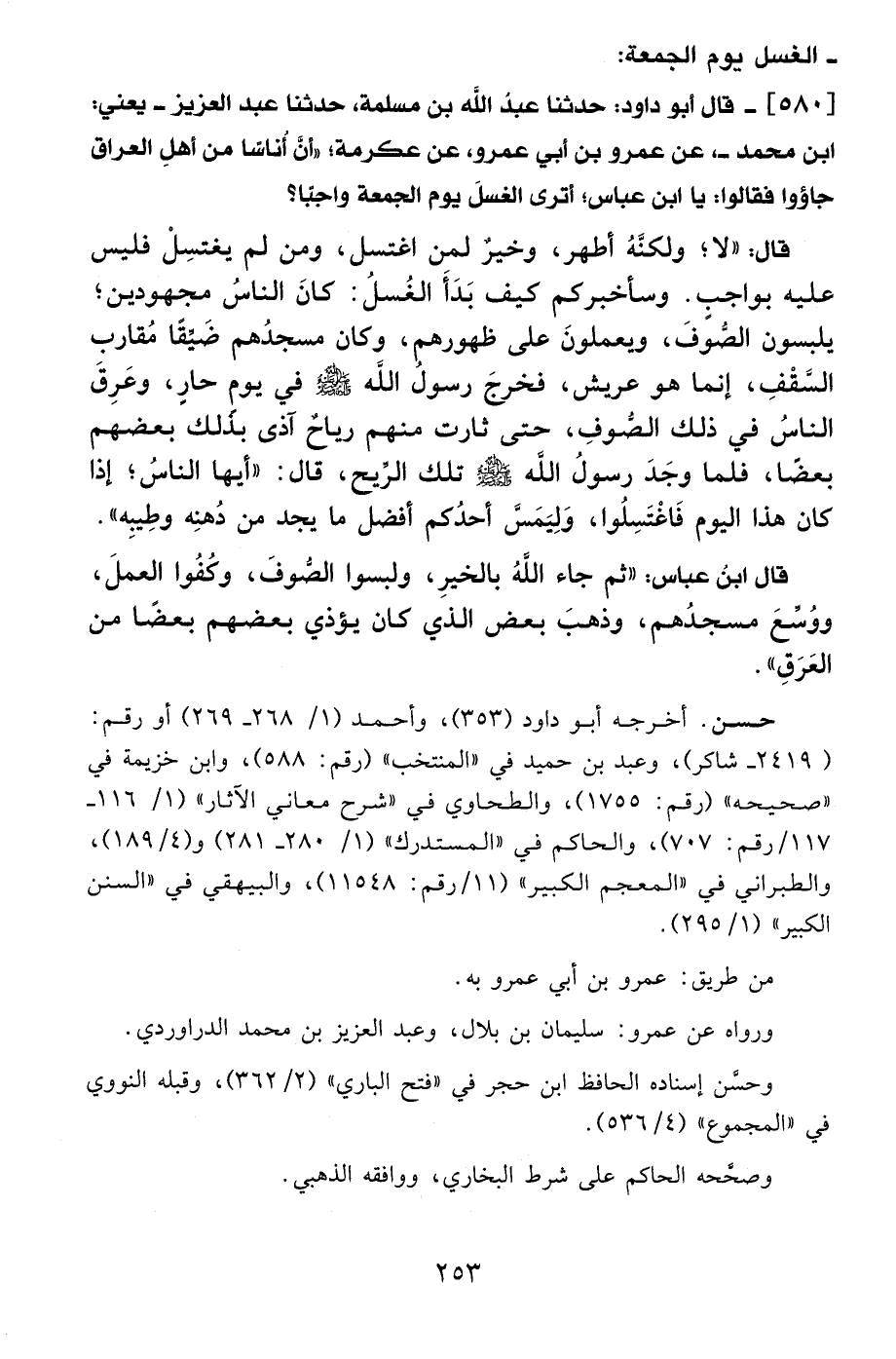579 - قال أبو داود: حدثنا عبدُ الله بن مسلمة، حدثنا عبد العزيز -يعني: ابن محمد-، عن عمرو بن أبي عمرو، عن عكرمة: "أنَّ أُناسًا من أهلِ العراق جاؤوا فقالوا: يا ابن عباس؛ أترى الغسلَ يوم الجمعة واجبًا؟