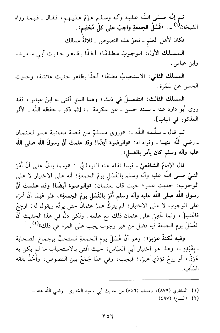 وفيه نُكتةٌ عزيزة: وهو أن غُسْلَ يومِ الجمعةِ مُستحبٌّ بإجماع الصحابة -بِقَيْدِهِ-، وهذا هو اختيار أبي العبَّاس؛ حيث أفتى بالاستحباب ما لمِ يكن به عَرَق، أو ريحٌ تؤذي غيرَه؛ فيجب، وفي هذا جَمْعٌ بين النصوص، وأخْذ بفقه السَّلَفِ.