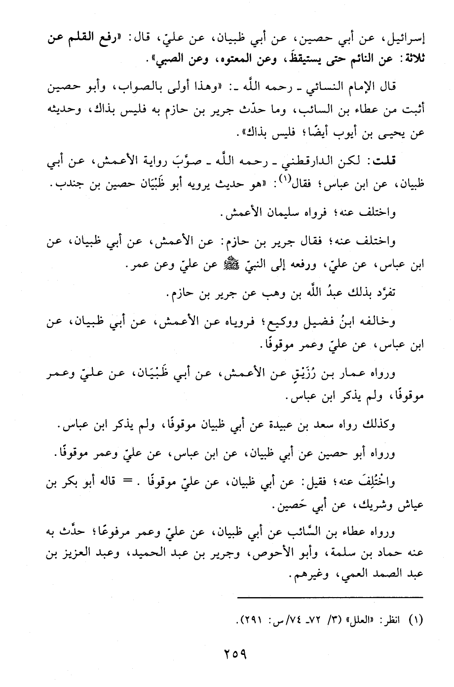 إسرائيل، عن أبي حصين، عن أبي ظبيان، عن عليّ، قال: "رفع القلم عن ثلاثة: عن النائم حتى يستيقظَ، وعن المعتوه، وعن الصبي".