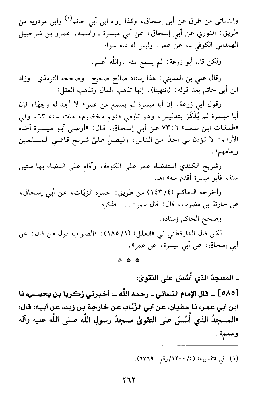 585 - قال الإمام النسائي -رَحِمَهُ اللهُ-: أخبرني زكريا بن يحيى، نا ابن أبي عمر، نا سفيان، عن أبي الزْنَادِ، عن خارجة بن زيد، عن أبيه، قال: "المسجدُ الذي أُسِّسَ على التقوى مسجدُ رسولِ الله - صلى الله عليه وآله وسلم -".
