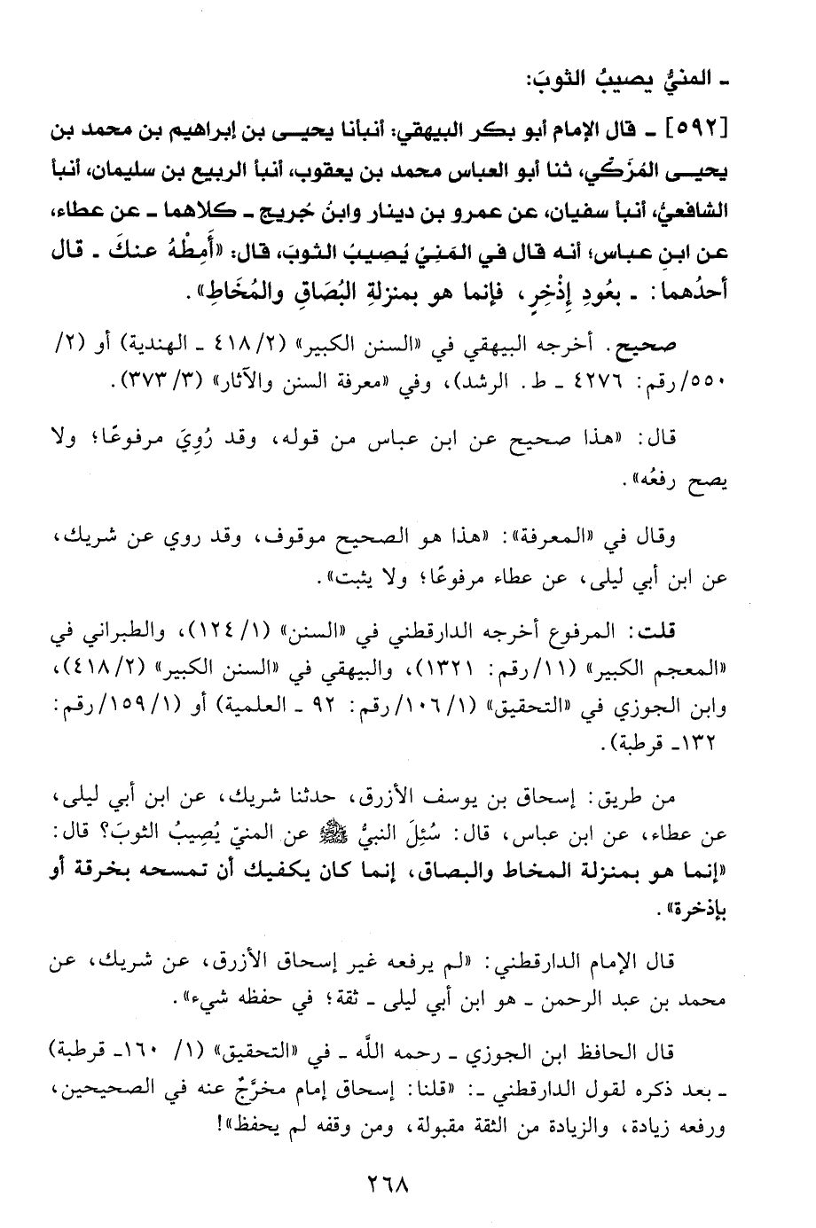 592 - قال الإمام أبو بكر البيهقي: أنبأنا يحيى بن إبراهيم بن محمد بن يحيى المُزَكي، ثنا أبو العباس محمد بن يعقوب، أنبأ الربيع بن سليمان، أنبأ الشافعيُّ، أنبأ سفيان، عن عمرو بن دينار وابن جُريج -كلاهما- عن عطاء، عن ابنِ عباس؛ أنه قال في المَنِي يُصِيبُ الثوبَ، قال: "أَمِطْهُ عنكَ -قال أحدُهما:- بعُودِ إِذْخِرٍ، فإنما هو بمنزلةِ البُصَاقِ والمُخَاطِ".