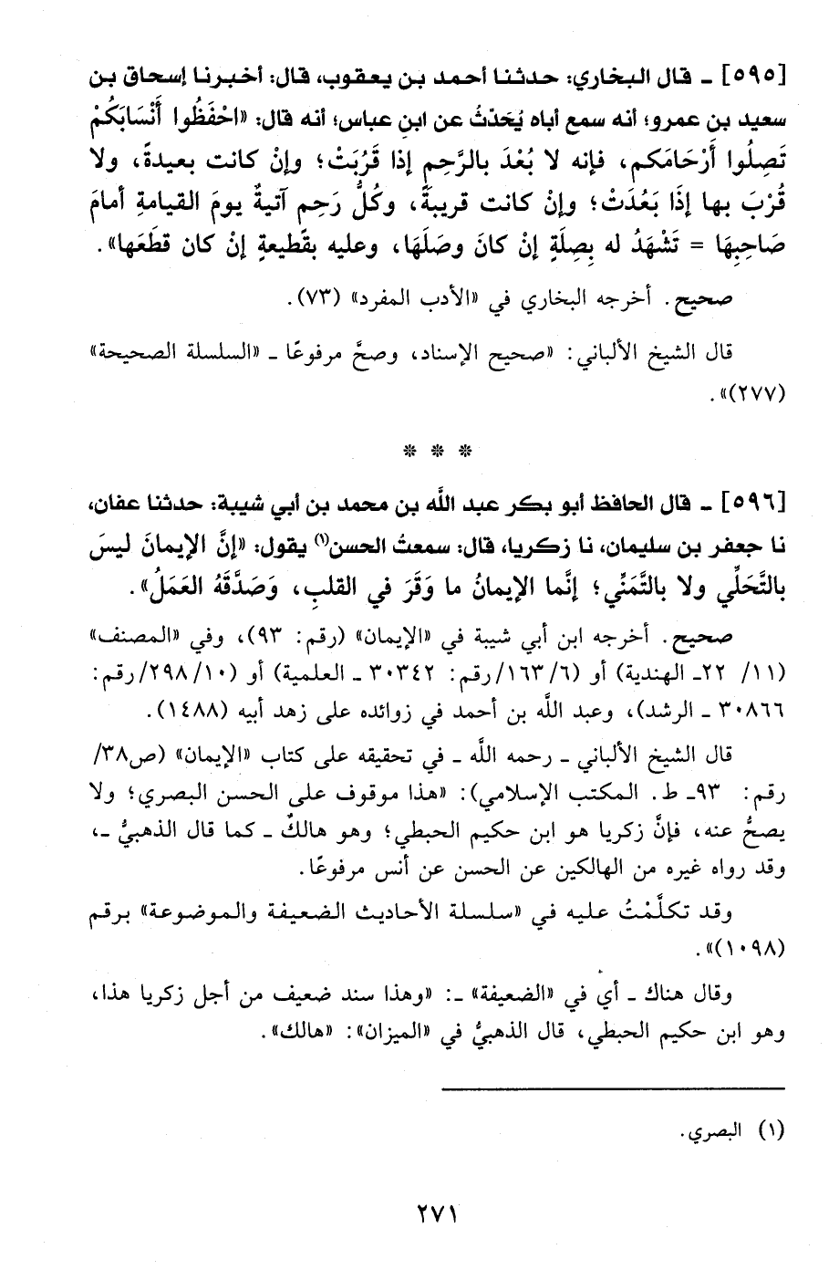 595 - قال البخاري: حدثنا أحمد بن يعقوب، قال: أخبرنا إسحاق بن سعيد بن عمرو؛ أنه سمع أباه يُحَدِّثُ عن ابنِ عباس؛ أنه قال: "احْفَظُوا أَنْسَابَكُمْ تَصِلُوا أَرْحَامَكم، فإنه لا بُعْدَ بالرَّحِم إذا قَرُبَتْ؛ وإنْ كانت بعيدةً، ولا قُرْبَ بها إذًا بَعُدَتْ؛ وإنْ كانت قريبة، وكُل رَحِم آتيةٌ يومَ القيامةِ أمامَ صَاحِبِهَا- تَشْهَدُ له بِصِلَة إنْ كانَ وصَلَهَا، وعليه بقطيعة إنْ كان قطَعَها".