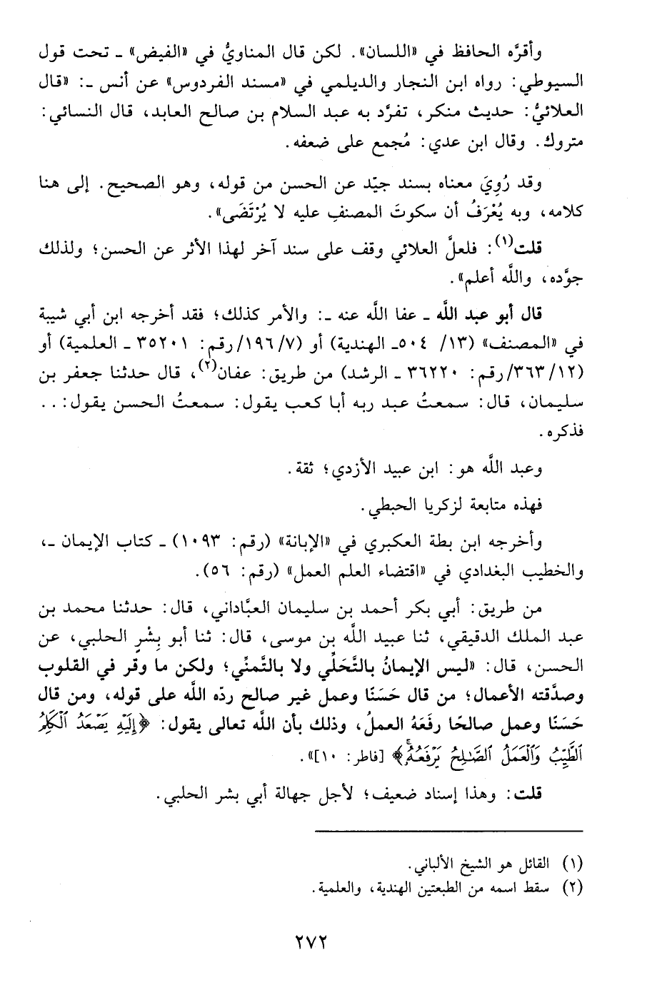 من طريق؛ أبي بكر أحمد بن سليمان العبَّاداني، قال: حدثنا محمد بن عبد الملك الدقيقي، ثنا عبيد الله بن موسى، قال: ثنا أبو بِشْرِ الحلبي، عن الحسن، قال: "ليس الإيمانُ بالتَّحَلِّي ولا بالتَّمنَّي؛ ولكن ما وقر في القلوب وصدَّقته الأعمال؛ من قال حَسَنَا وعمل غير صالح ردّه الله على قوله، ومن قال حَسَنَا وعمل صالحَا رفَعَهُ العملُ، وذلك بأن الله تعالى يقول: {إِلَيْهِ يَصْعَدُ الْكَلِمُ الطَّيِّبُ وَالْعَمَلُ الصَّالِحُ يَرْفَعُهُ} [فاطر: 10].
