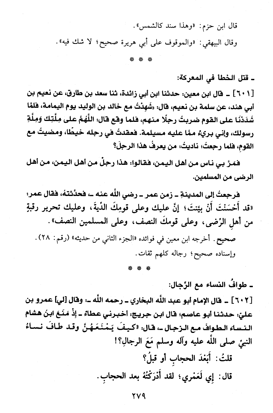 602 - قال الإمام أبو عبد الله البخاري -رَحِمَهُ اللهُ-: وقال [لي] عمرو بن عليّ: حدثنا أبو عاصم، قال ابن جريج: أخبرني عطاءٌ - إِذْ مَنَعَ ابنُ هشام النساء الطواف مع الرجال-، قال: "كيفَ يَمْنَعَهُنَّ وقد طافَ نساءُ النبيِّ - صلى الله عليه وآله وسلم - مَعَ الرجالِ؟!