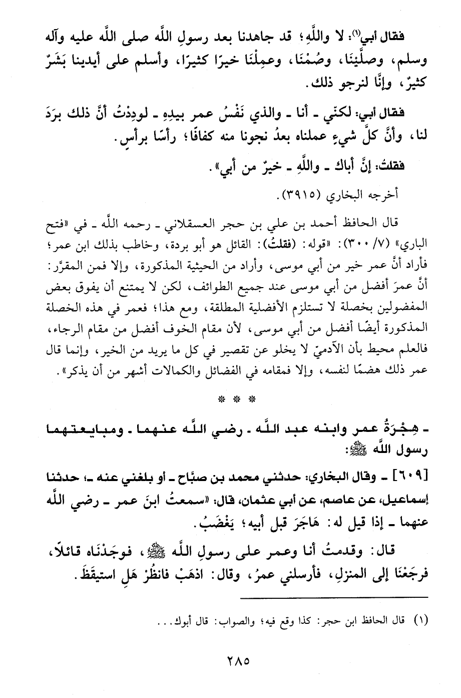 قال الحافظ أحمد بن علي بن حجر العسقلاني -رَحِمَهُ اللهُ- في "فتح الباري" (7/ 300): "قوله: (فقلتُ): القائل هو أبو بردة، وخاطب بذلك ابن عمر؛ فأراد أن عمر خير من أبي موسى، وأراد من الحيثية المذكورة، وإلا فمن المقرَّر: أنَّ عمرَ أفضل من أبي موسى عند جميع الطوائف، لكن لا يمتنع أن يفوق بعض المفضولين بخصلة لا تستلزم الأفضلية المطلقة، ومع هذا؛ فعمر في هذه الخصلة المذكورة أيضًا أفضل من أبي موسى، لأن مقام الخوف أفضل من مقام الرجاء، فالعلم محيط بأن الآدميّ لا يخلو عن تقصير في كل ما يريد من الخير، وإنما قال عمر ذلك هضمًا لنفسه، وإلا فمقامه في الفضائل والكمالات أشهر من أن يذكر".