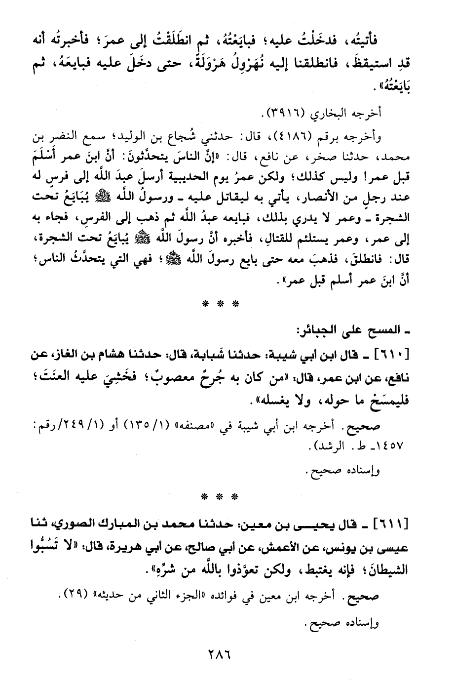 610 - قال ابن أبي شيبة: حدثنا شَبابة، قال: حدثنا هشام بن الغاز، عن نافع، عن ابن عمر، قال: "من كان به جُرحٌ معصوبٌ؛ فخَشِيَ عليه العنَتَ؛ فليمسَحْ ما حوله، ولا يغسله ".