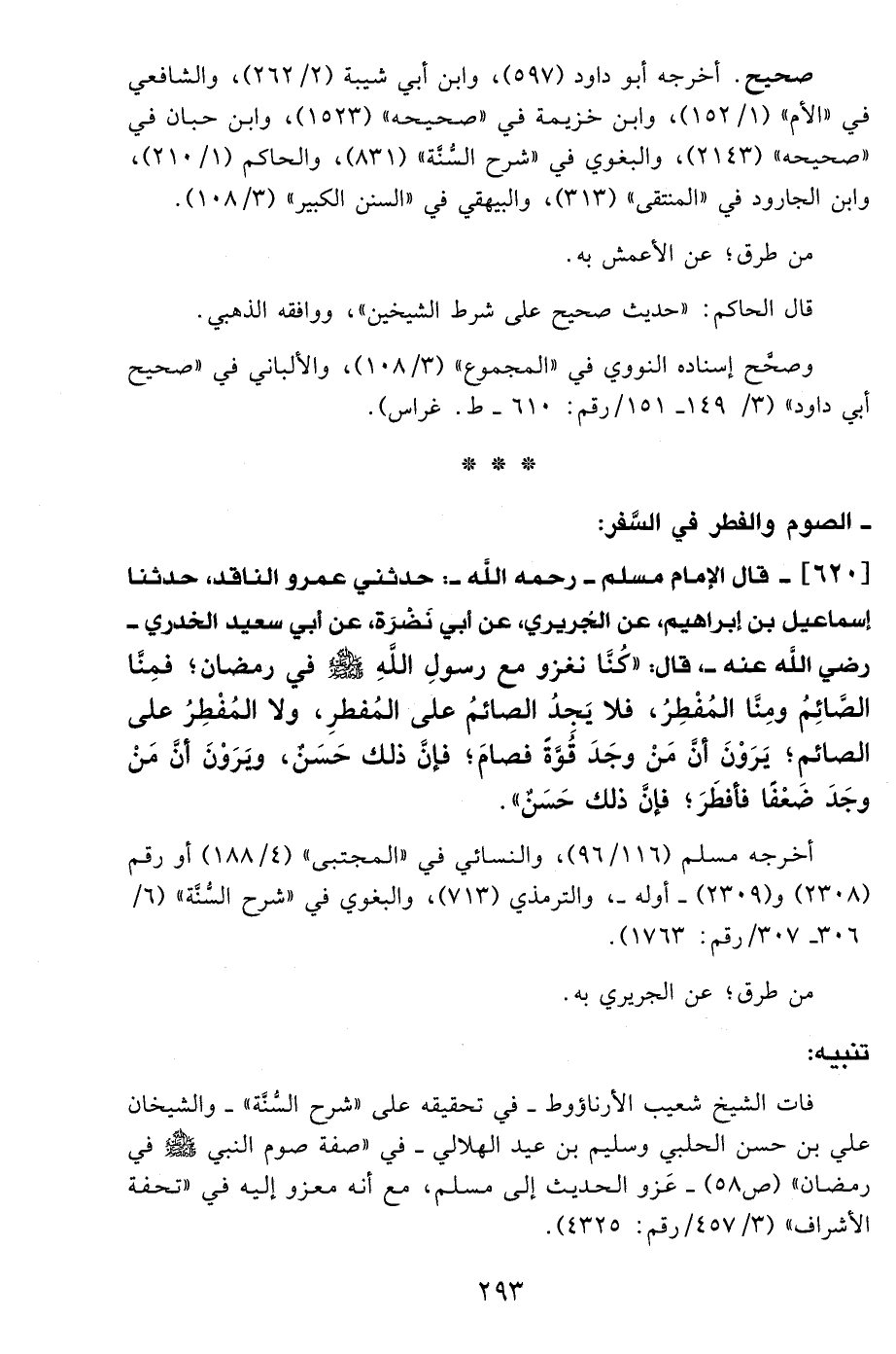620 - قال الإمام مسلم -رَحِمَهُ اللهُ-: حدثني عمرو الناقد، حدثنا إسماعيل بن إبراهيم، عن الجُريري، عن أبي نَضرَة، عن أبي سعيد الخدري- رضي الله عنه --, قال: "كُنَّا نغزو مع رسولِ اللهِ - صلى الله عليه وسلم - في رمضان؛ فمِنَّا الصَّائِمُ ومِنَّا المُفْطِرُ، فلا يَجِدُ الصائمُ على المُفطرِ، ولا المُفْطِرُ على الصائم؛ يَرَوْنَ أنَّ مَنْ وجَدَ قُوَّةَ فصامَ؛ فإن ذلك حَسَن، ويرَوْنَ أنَّ مَنْ وجَدَ ضَعْفَا فأفطَرَ؛ فإنَّ ذلك حَسَنٌ".