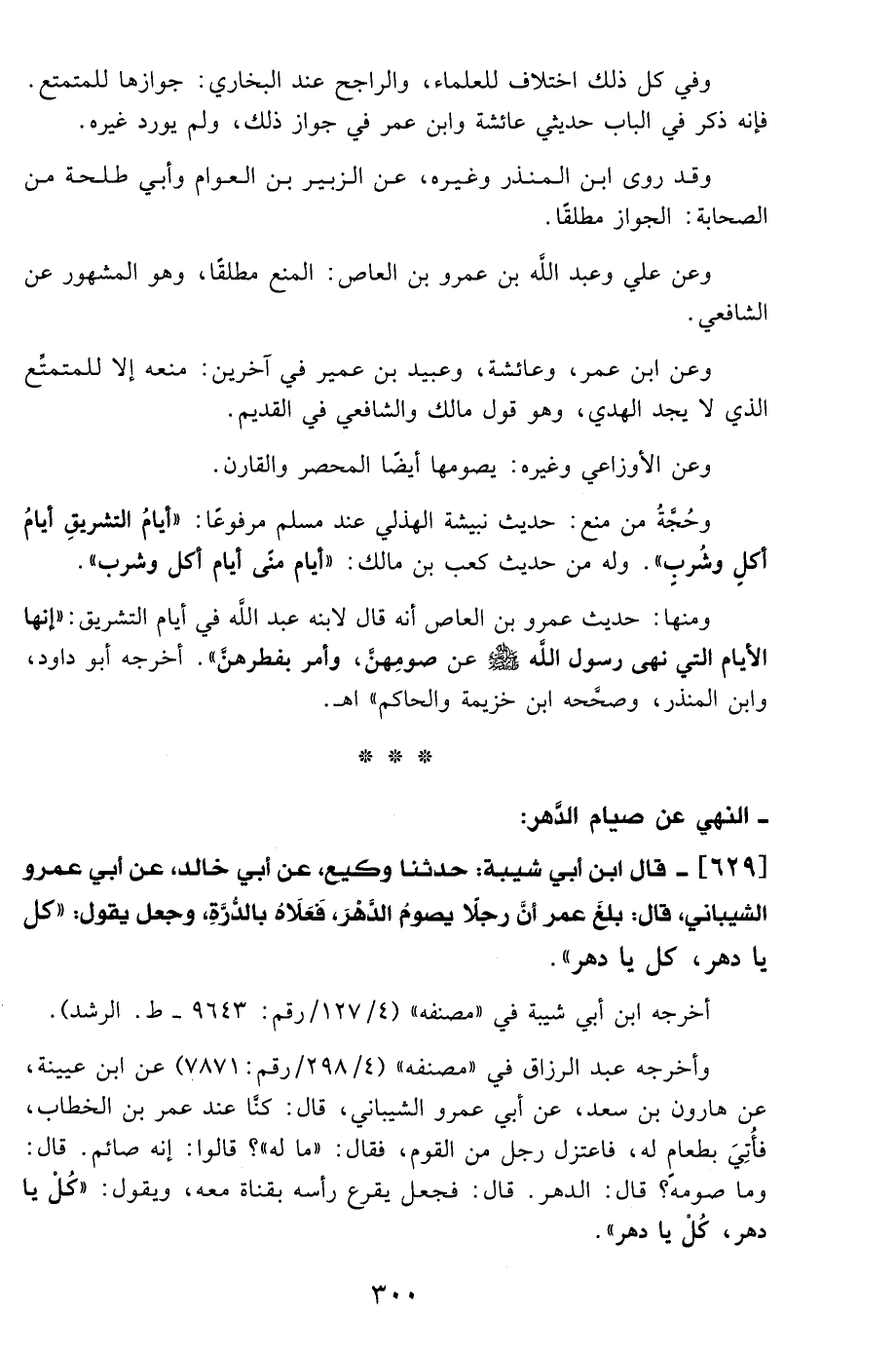 629 - قال ابن أبي شيبة: حدثنا وحيع، عن أبي خالد، عن أبي عمرو الشيباني، قال: بلغَ عمر أنَّ رجلًا يصومُ الدَّهْرَ، فَعَلَاهُ بالدُّرَّةِ، وجعل يقول: "كل يا دهر، كل يا دهر".