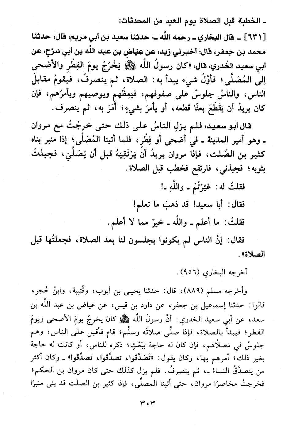 وأخرجه مسلم (889)، قال: حدثنا يحيى بن أيوب، وقُتيبة، وابنُ حُجر، قالوا: حدثنا إسماعيل بن جعفر، عن داود بن قيس، عن عياض بن عبد الله بن سعد، عن أبي سعيد الخدري: أن رسولَ الله -عَزَّ وَجَلَّ- كان يخرجُ يومَ الأضحى ويومَ الفطر؛ فيبدأ بالصلاة، فإذا صلّى صلاتَه وسلَّم؛ قام فأقبل على الناس، وهم جلوسْ في مصلَّاهم، فإن كان له حاجة ببَعْثٍ؛ ذكره للناس، أو كانت له حاجة بغير ذلك؛ أمرهم بها، وكان يقول: "تَصَدَّقوا، تصدَّقوا، تصدَّقوا"- وكان أكثر من يتصدَّقُ النساءُ-، ثم ينصرفُ. فلم يزل كذلك حتى كان مروان بن الحكم؛ فخرجتُ مخاصرًا مروان، حتى أتينا المصلَّى، فإذا كثير بن الصلت قد بنى منبرًا