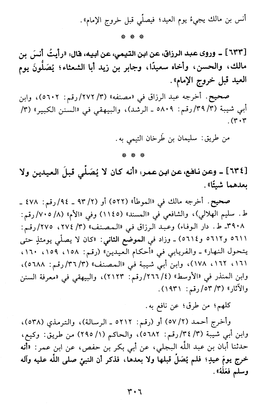 633 - وروى عبد الرزاق، عن ابن التيمي، عن أبيه، قال: "رأيتُ أنسَ بن مالك، والحسن، وأخاه سعيدًا، وجابر بن زيد أبا الشعثاء؛ يُصَلُّونَ يوم العيد قبل خروج الإمام".