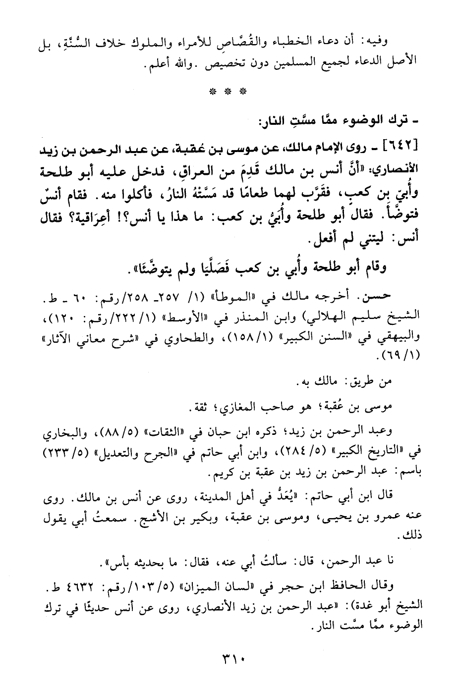 642 - روى الإمام مالك، عن موسى بن عُقبة، عن عبد الرحمن بن زيد الأنصاري: "أنَّ أنس بن مالك قَدِمَ من العراقِ، فدخل عليه أبو طلحة وأُبي بن كعب، فقَرَّب لهما طعامَا قد مَستْهُ النارُ، فأكلوا منه. فقام أنسٌ فتوضأ. فقالَ أبو طلحة وأُبَي بن كعب: ما هذا يا أنس؟! أعِرَاقية؟ فقال أنس: ليتني لم أفعل.