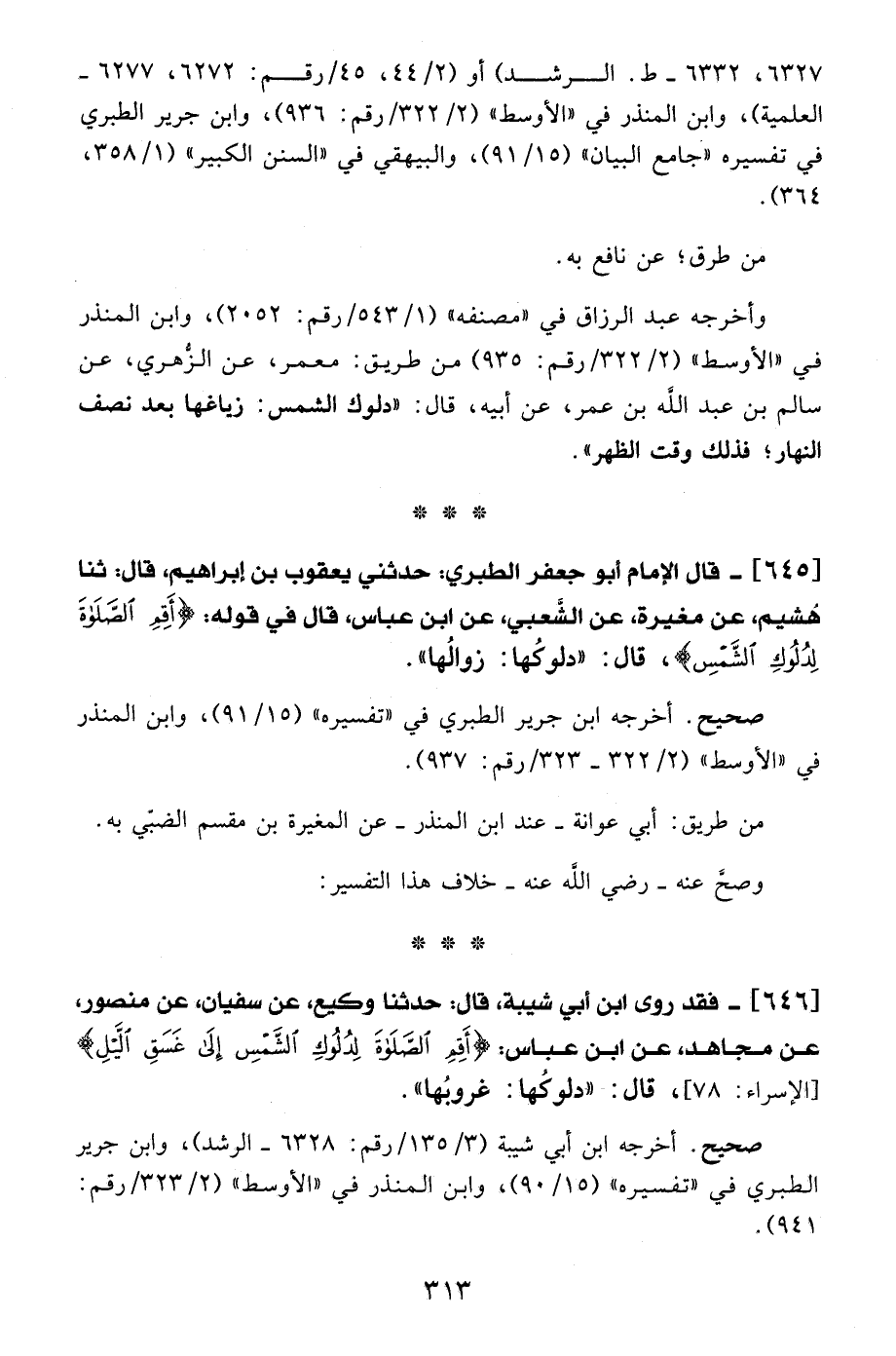 645 - قال الإمام أبو جعفر الطبري: حدثني يعقوب بن إبراهيم، قال: ثنا هُشيم، عن مغيرة، عن الشَّعبي، عن ابن عباس، قال في قوله: {أَقِمِ الصَّلَاةَ لِدُلُوكِ الشَّمْسِ}، قال: "دلوكُها: زوالُها".