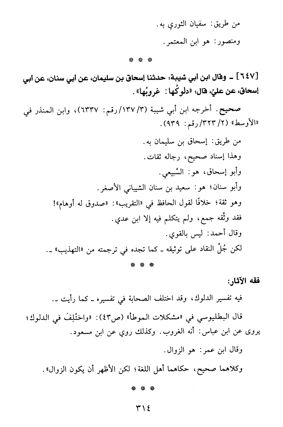 647 - وقال ابن أبي شيبة: حدثنا إسحاق بن سليمان، عن أبي سنان، عن أبي إسحاق، عن عليّ، قال: "دلوكُها: غروبُها".
