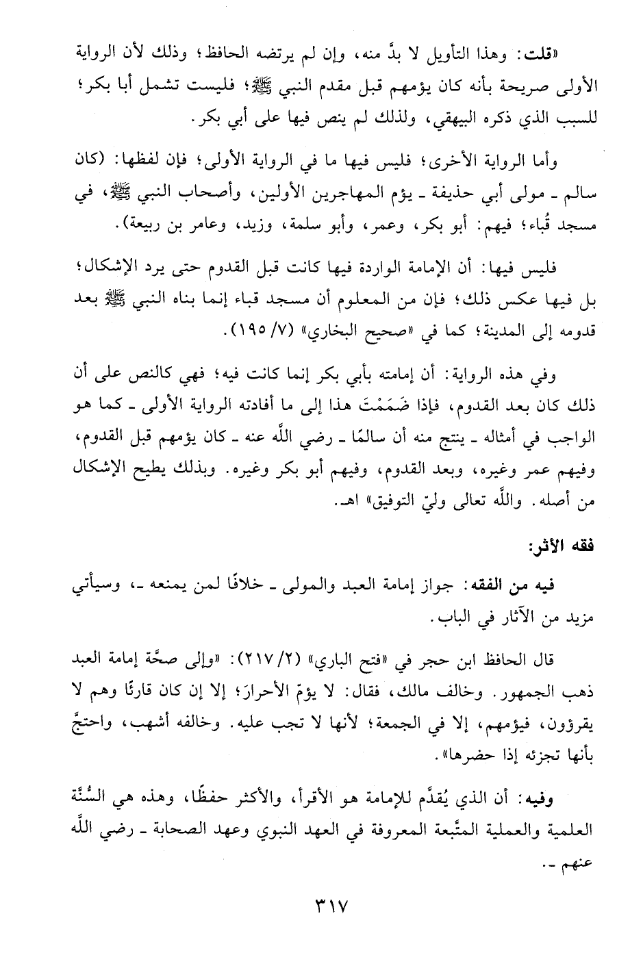 "قلت: وهذا التأويل لا بدَّ منه، كان لم يرتضه الحافظ؛ وذلك لأن الرواية الأولى صريحة بأنه كان يؤمهم قبل مقدم النبي - صلى الله عليه وسلم -؛ فليست تشمل أبا بكر؛ للسبب الذي ذكره البيهقي، ولذلك لم ينص فيها على أبي بكر.