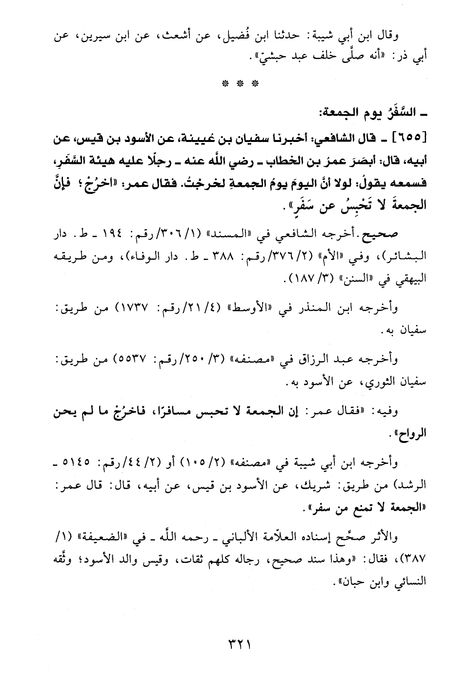 655 - قال الشافعي: أخبرنا سفيان بن عُيينة، عن الأسود بن قيس، عن أبيه، قال: أبصَرَ عمرُ بن الخطاب - رضي الله عنه - رجلا عليه هيئة السَّفَرِ، فسمعه يقولُ: لولا أنَّ اليومَ يومُ الجمعةِ لخرجْتُ. فقال عمر: "اخرُجْ؛ فإنَّ الجمعةَ لا تَحْبِسُ عن سَفَرٍ".