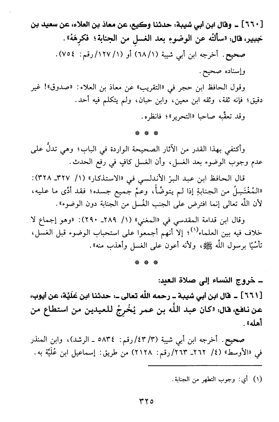 661 - قال ابن أبي شيبة -رَحِمَهُ اللهُ تَعَالَى-: حدثنا ابن عُلَيَّة، عن أيوب، عن نافع، قال: "كان عبد الله بن عمر يُخْرِجُ للعيدين من استطاع من أهله".