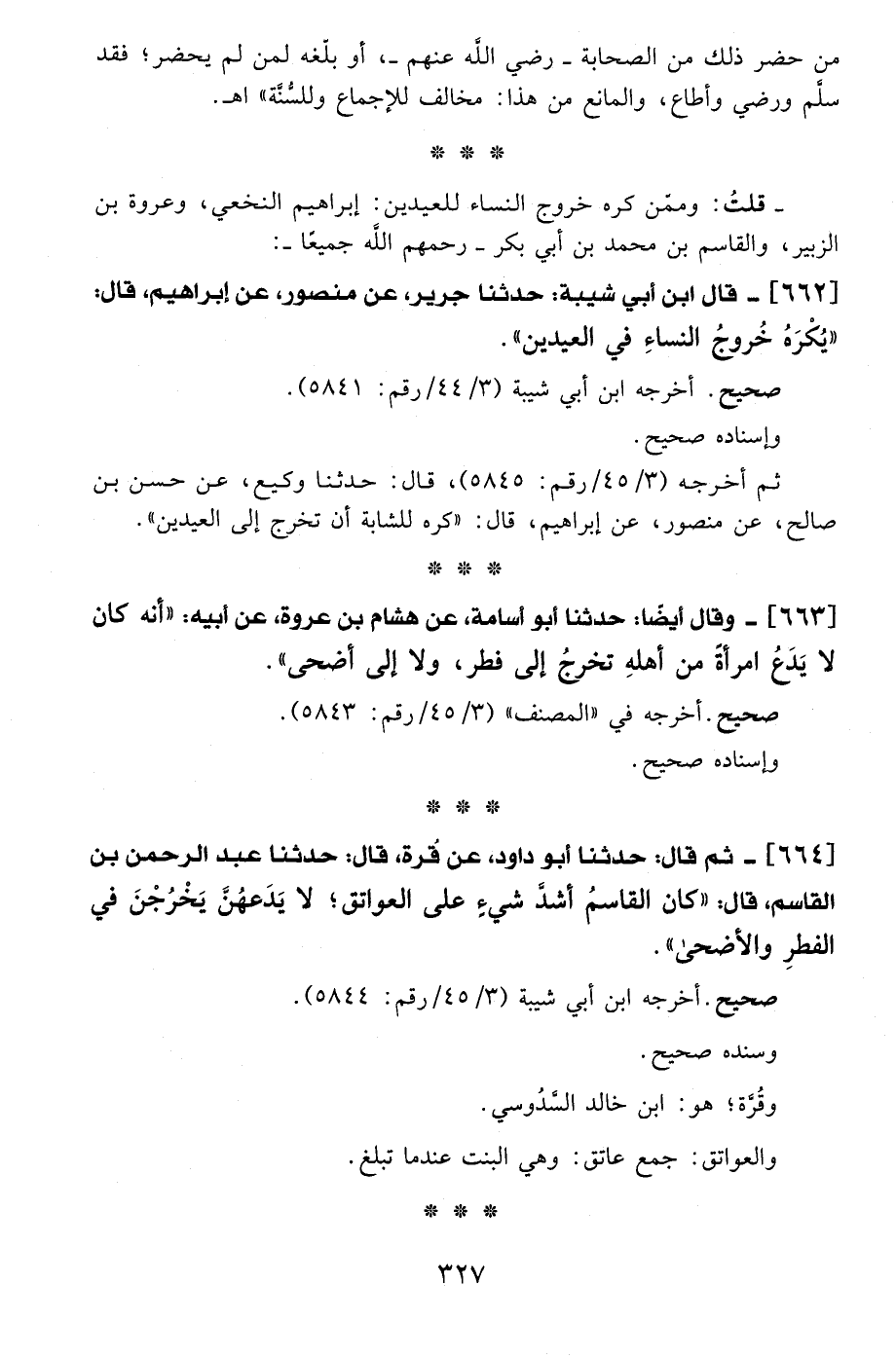 663 - وقال أيضًا: حدثنا أبو أسامة، عن هشام بن عروة، عن أبيه: "أنه كان لا يَدعُ امرأة من أهلهِ تخرجُ إلى فطر، ولا إلى أضحى".