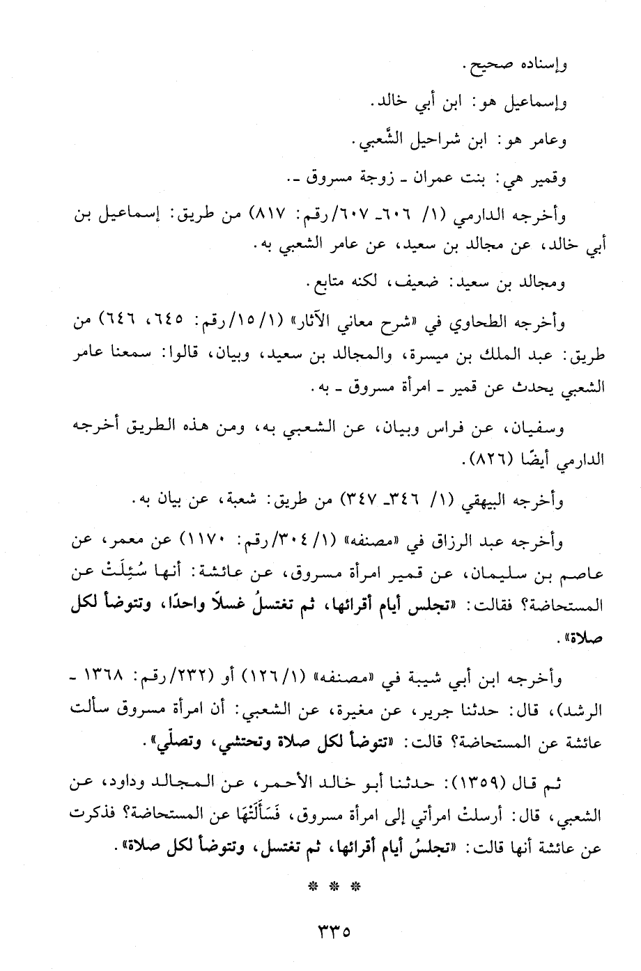 ثم قال (1359): حدثنا أبو خالد الأحمر، عن المجالد وداود، عن الشعبي، قال: أرسلتْ امرأتي إلى امرأة مسروق، فَسَأَلَتْها عن المستحاضة؟ فذكرت عن عائشة أنها قالت: "تجلسُ أيام أقرائها، ثم تغتسل، وتتوضأ لكل صلاة".
