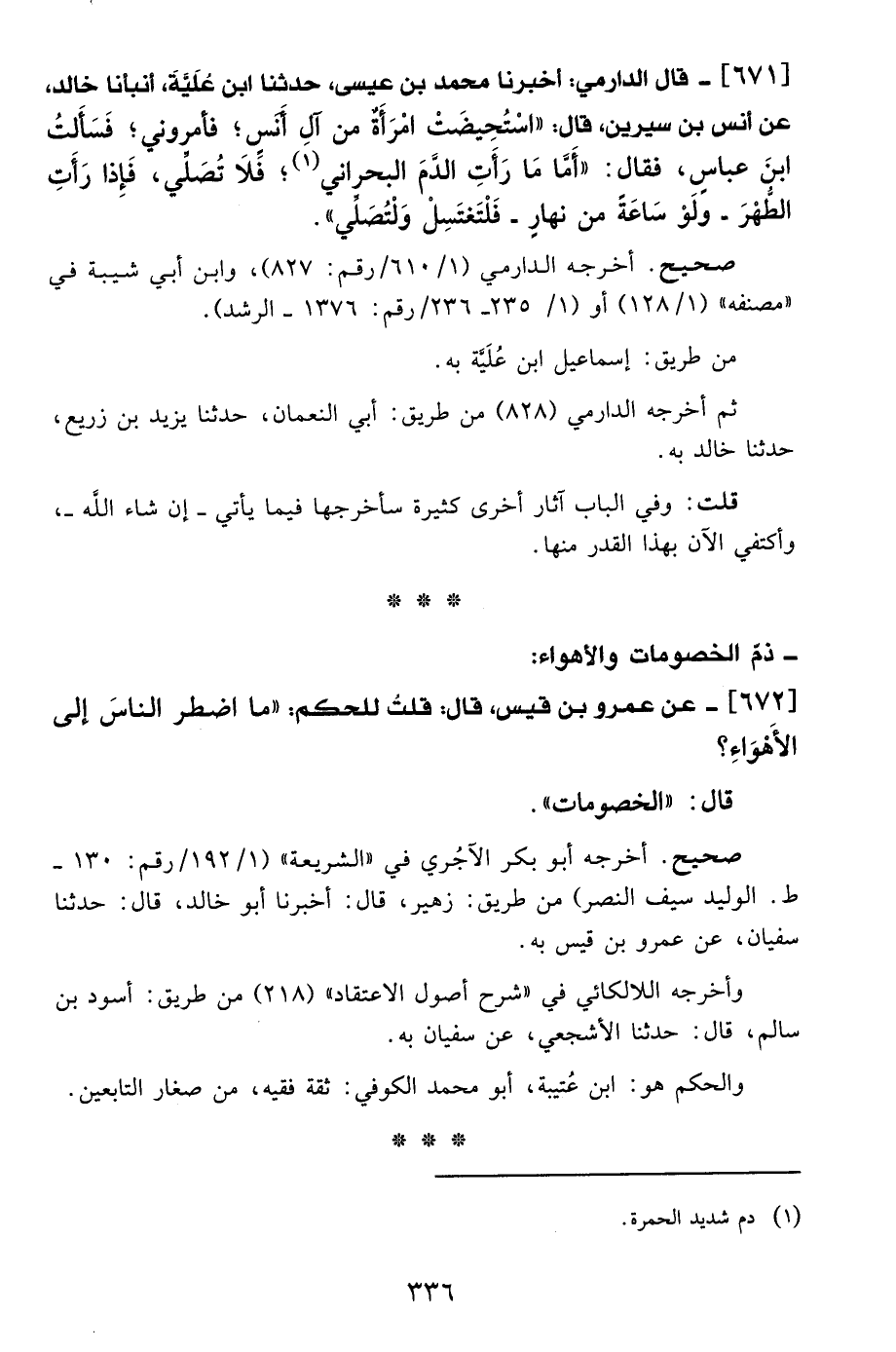 671 - قال الدارمي: أخبرنا محمد بن عيسى، حدثنا ابن عُلَيَّةَ، أنبأنا خالد، عن أنس بن سيرين، قال: "اسْتُحِيضَتْ امرَأَةٌ من آلِ أَنسٍ؛ فأمروني؛ فَسَأَلتُ ابنَ عباس، فقال: "أَمَّا مَا رَأَتِ الدَّمَ البحراني (¬1)؛ فَلاَ تُصَلِّي، فَإذا رَأَتِ الطُّهْرَ -ولَوْ سَاعَةً من نهارٍ- فَلْتَغتَسِلْ وَلْتُصَلِّي".