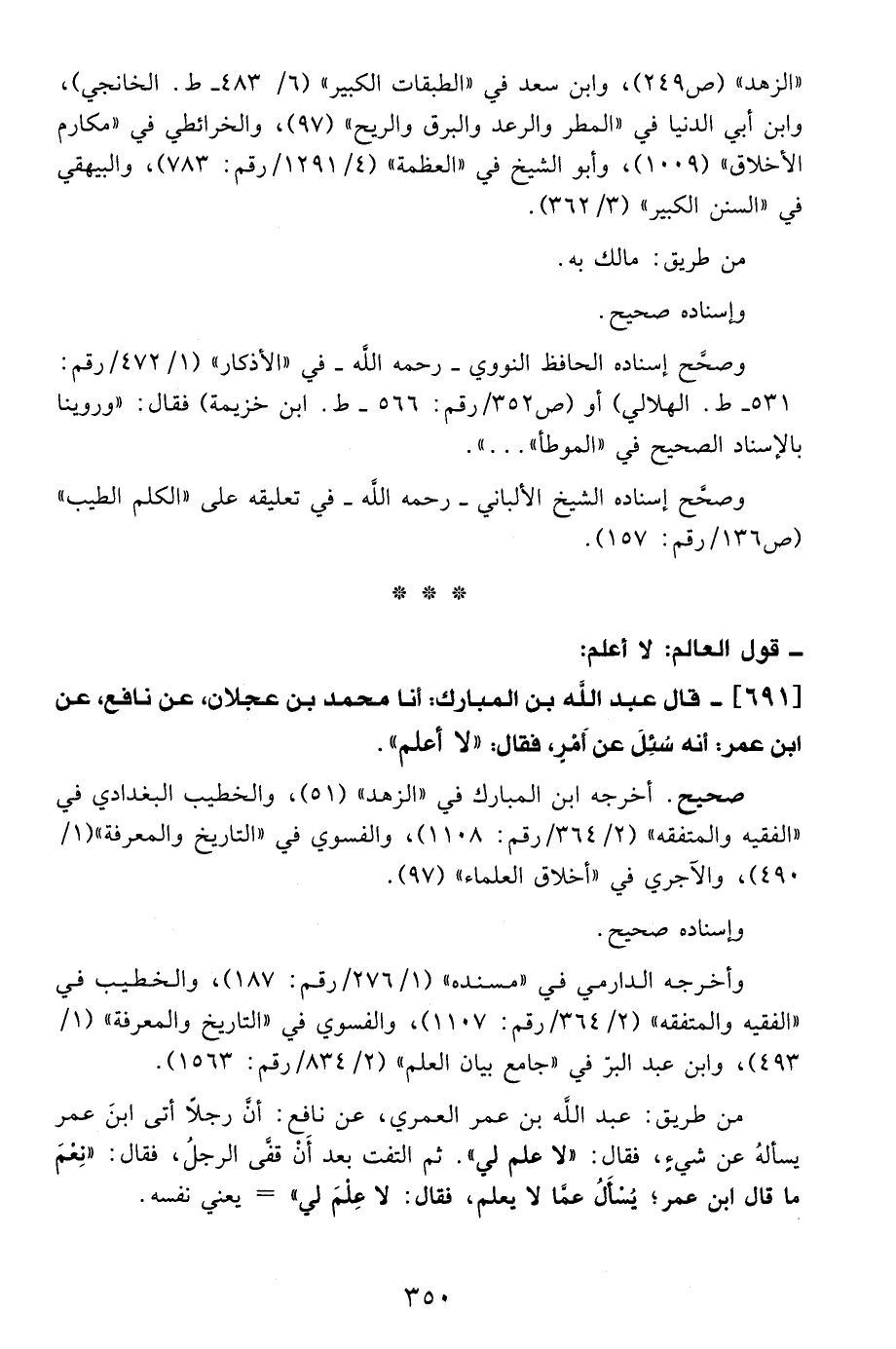 من طريق: عبد الله بن عمر العمري، عن نافع: أن رجلًا أتى ابنَ عمر يسألهُ عن شيءِ، فقال: "لا علم لي". ثم التفت بعد أَنْ قفَّى الرجلُ، فقال: "نِعْمَ ما قال ابن عمر؛ يُسأَلُ عمَّا لا يعلم، فقال: لا عِلْمَ لي" = يعني نفسه.