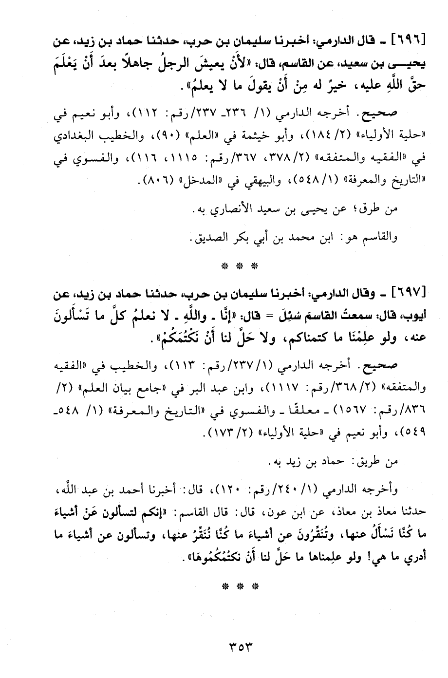 697 - وقال الدارمي: أخبرنا سليمان بن حرب، حدثنا حماد بن زيد، عن أيوب، قال: سمعت القاسمَ سُئِلَ- قال: "إنّا -واللهِ- لا نعلمُ كلَّ ما تَسْأَلونَ عنه، ولو علِمنَا ما كتمناكم، ولا حَلَّ لنا أَنْ نَكْتُمَكُم".