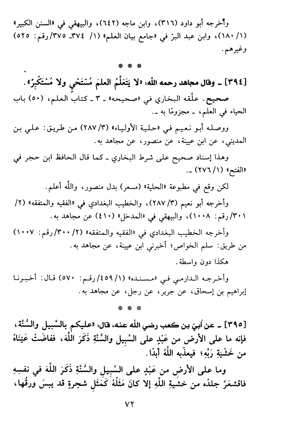 394 - وقال مجاهد -رَحِمَهُ اللهُ-: "لا يَتَعَلَّمُ العلمَ مُسْتَحْي ولا مُسْتَكْبِرٌ".
